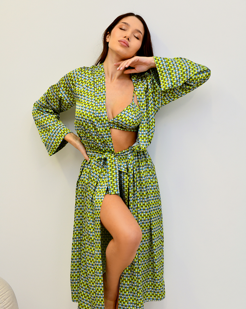 Яскравий піжамний костюм-трійка: довгий халат із поясом, короткі шортики на резинці та топ із застібкою.