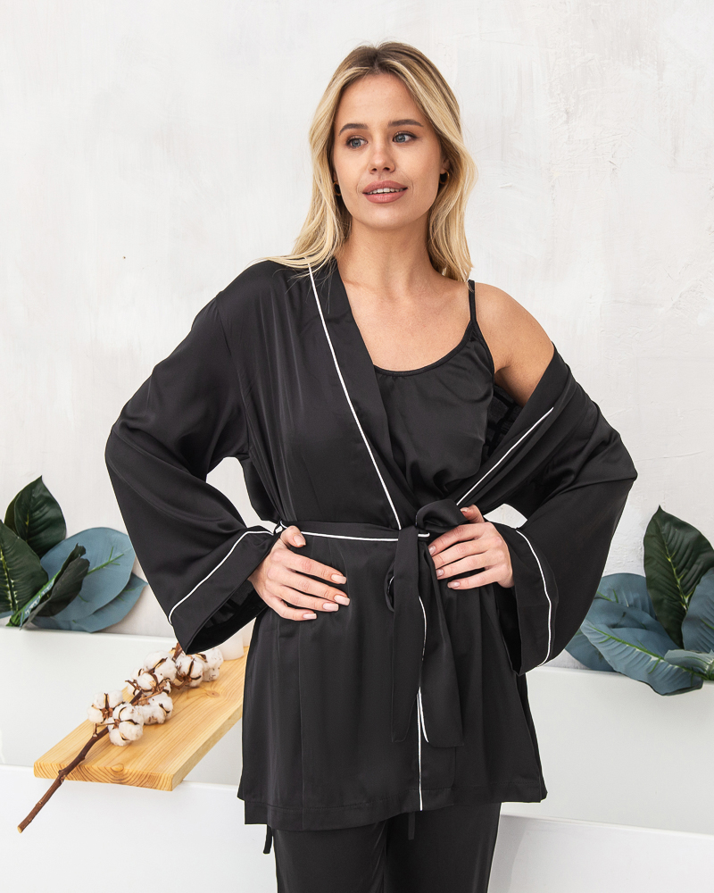 Піжамний костюм четвірка Raya (штани+майка+шорти+халат) з шовку Армані Чорний 2538 QC фото - Luxbikini