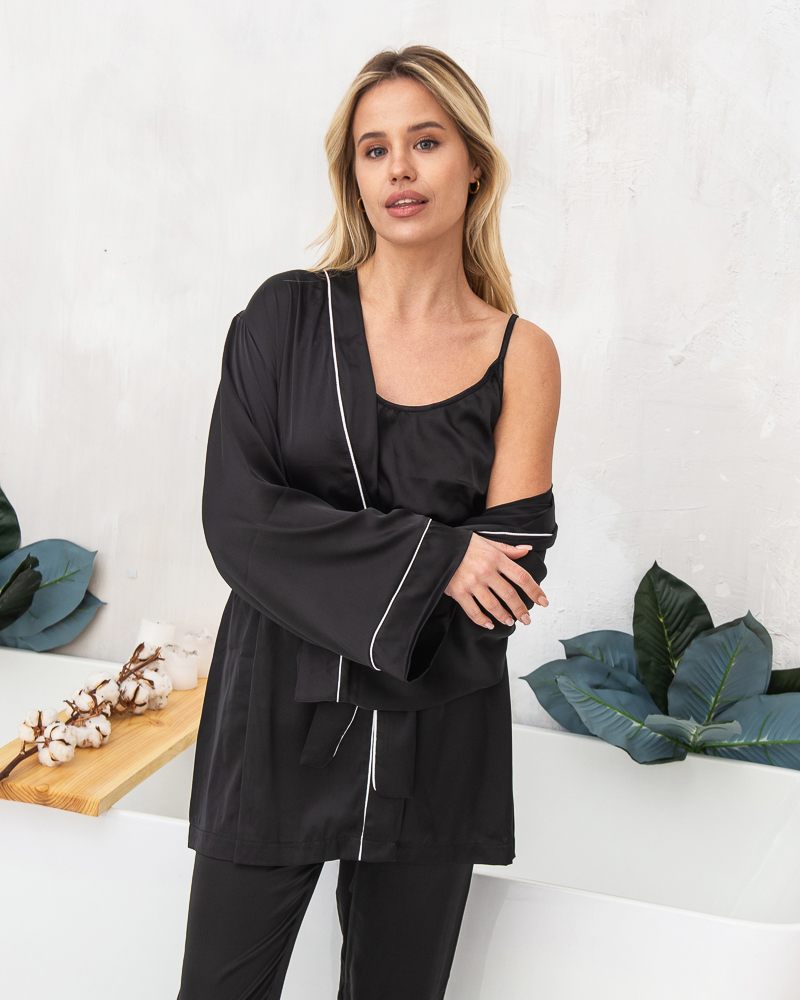 Піжамний костюм четвірка Raya (штани+майка+шорти+халат) з шовку Армані Чорний