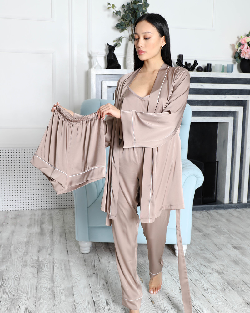 Піжамний костюм четвірка Raya (штани+майка+шорти+халат) з шовку Армані Бежевий