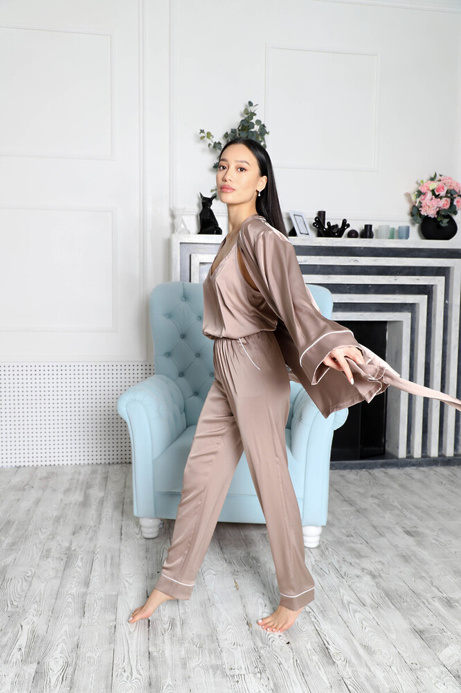 Піжамний костюм четвірка Raya (штани+майка+шорти+халат) з шовку Армані Бежевий