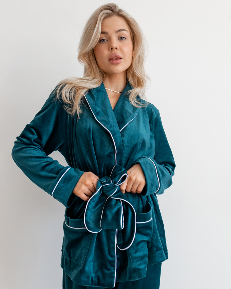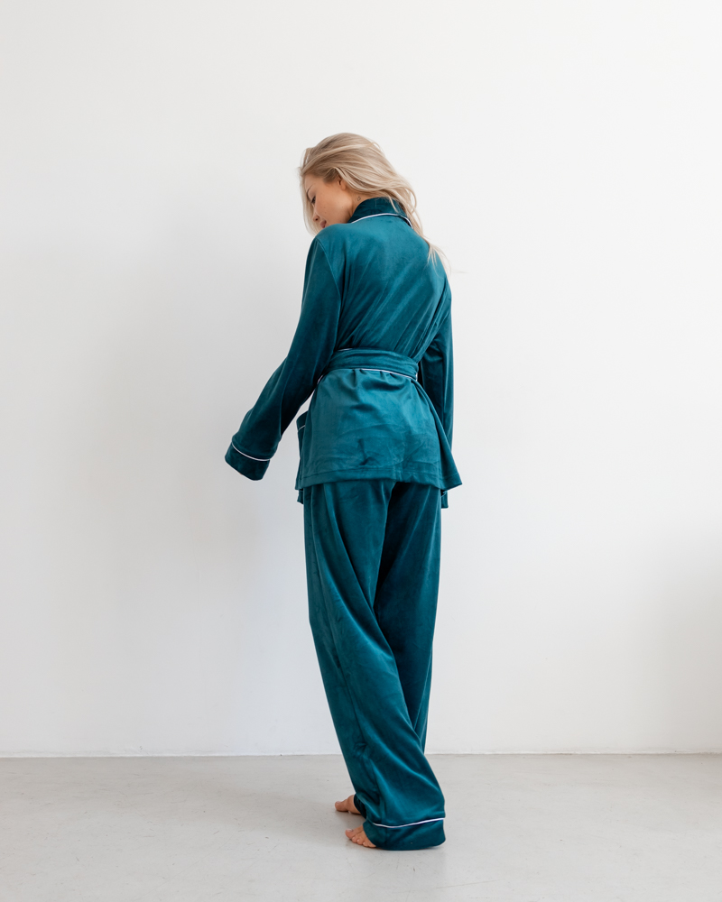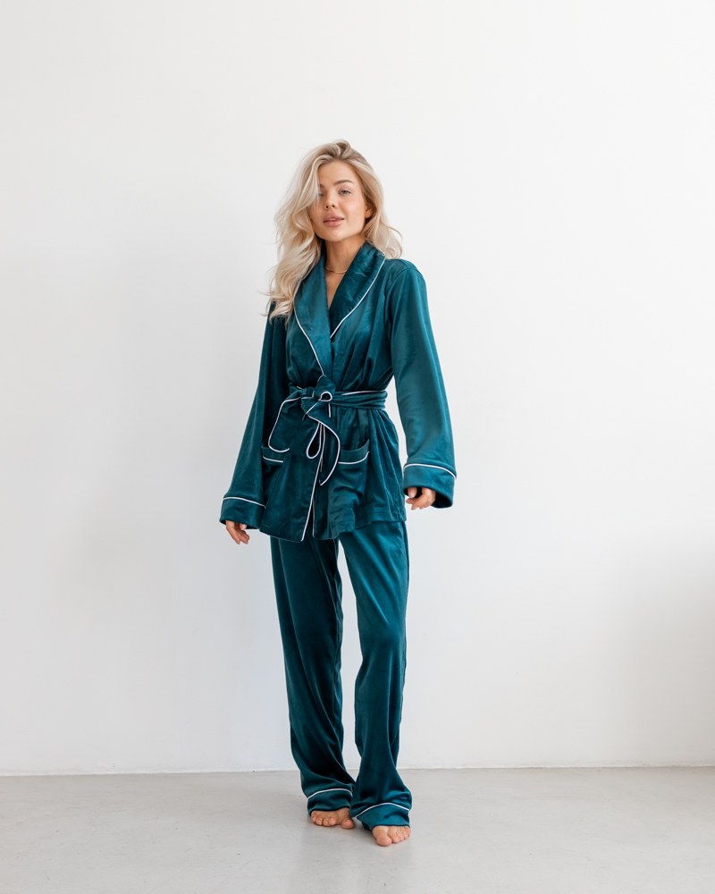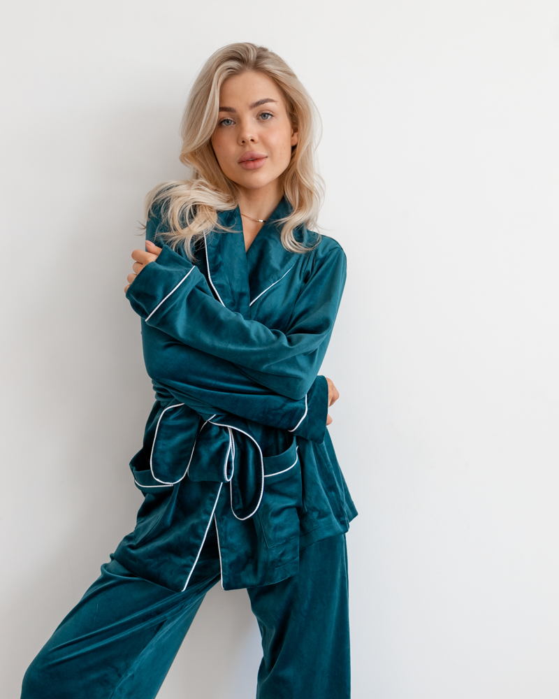 Комплект: Штани + Сорочка. Класичні штани вільного крою з резинкою на талії та кишенями. Сорочка з поясом на запах, всередині на зав'язках.