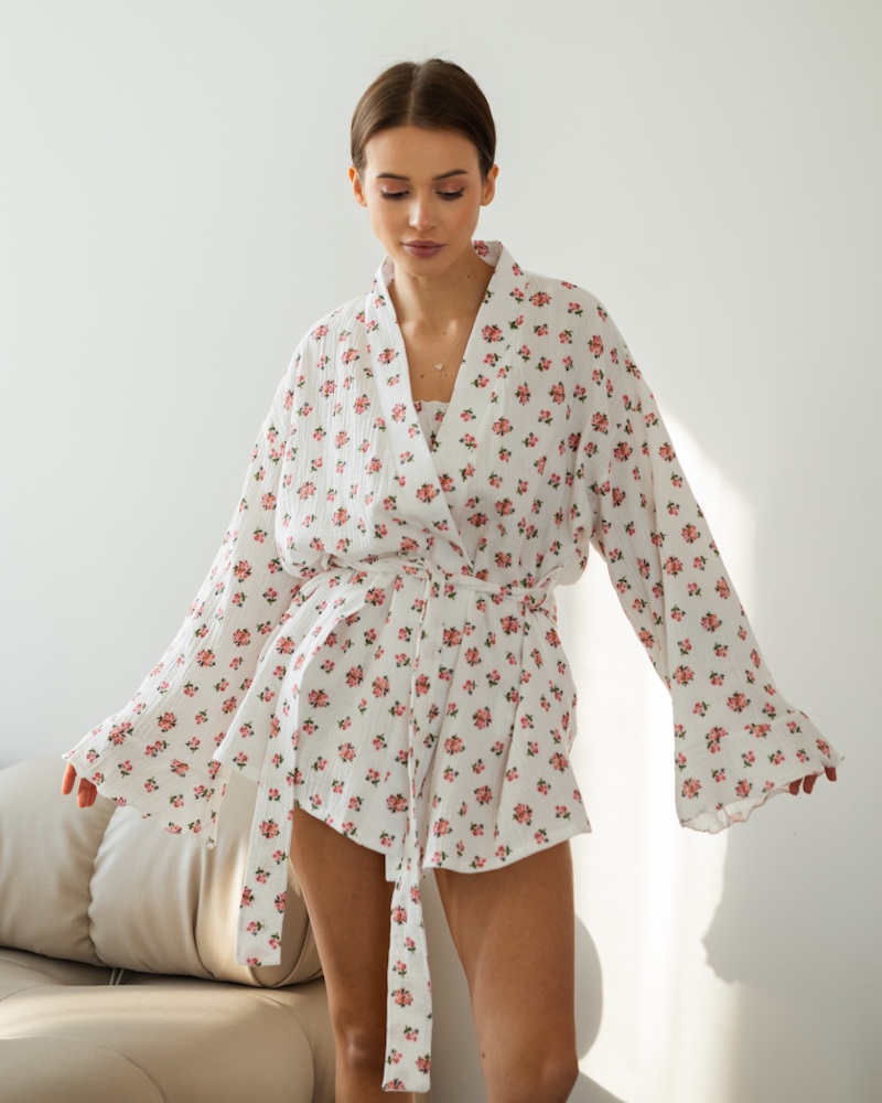 Комплект: короткий халат-кімоно із рюшами на рукавах, зручний топ на резинці та короткі шорти із маленькими рюшами.