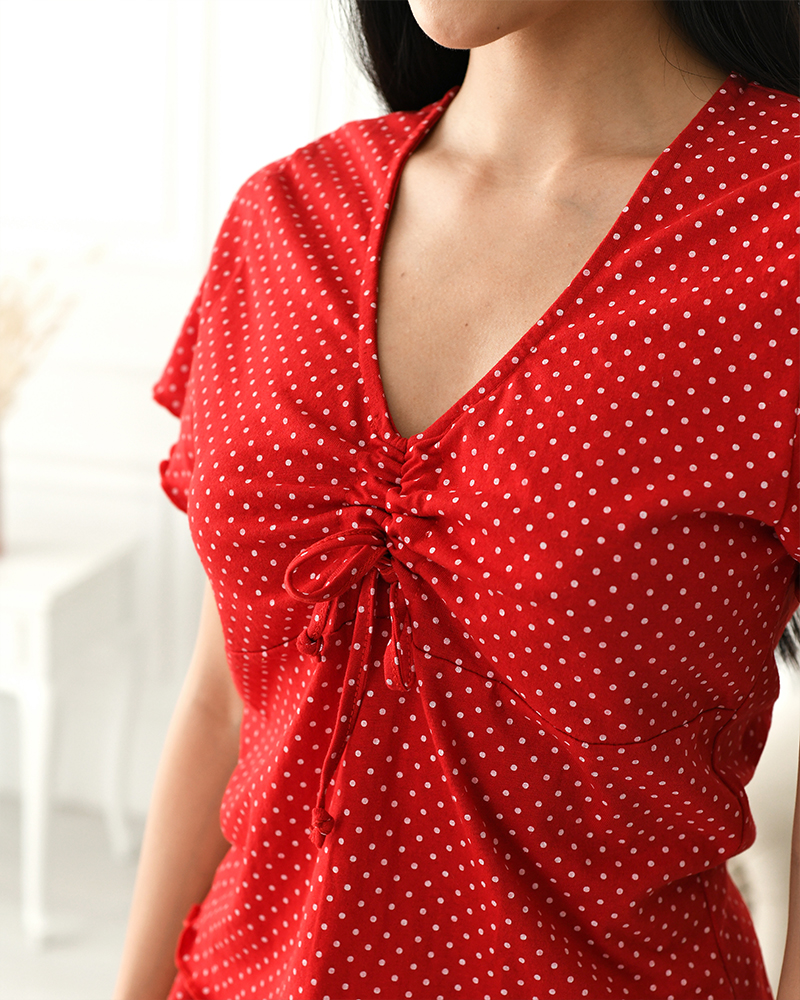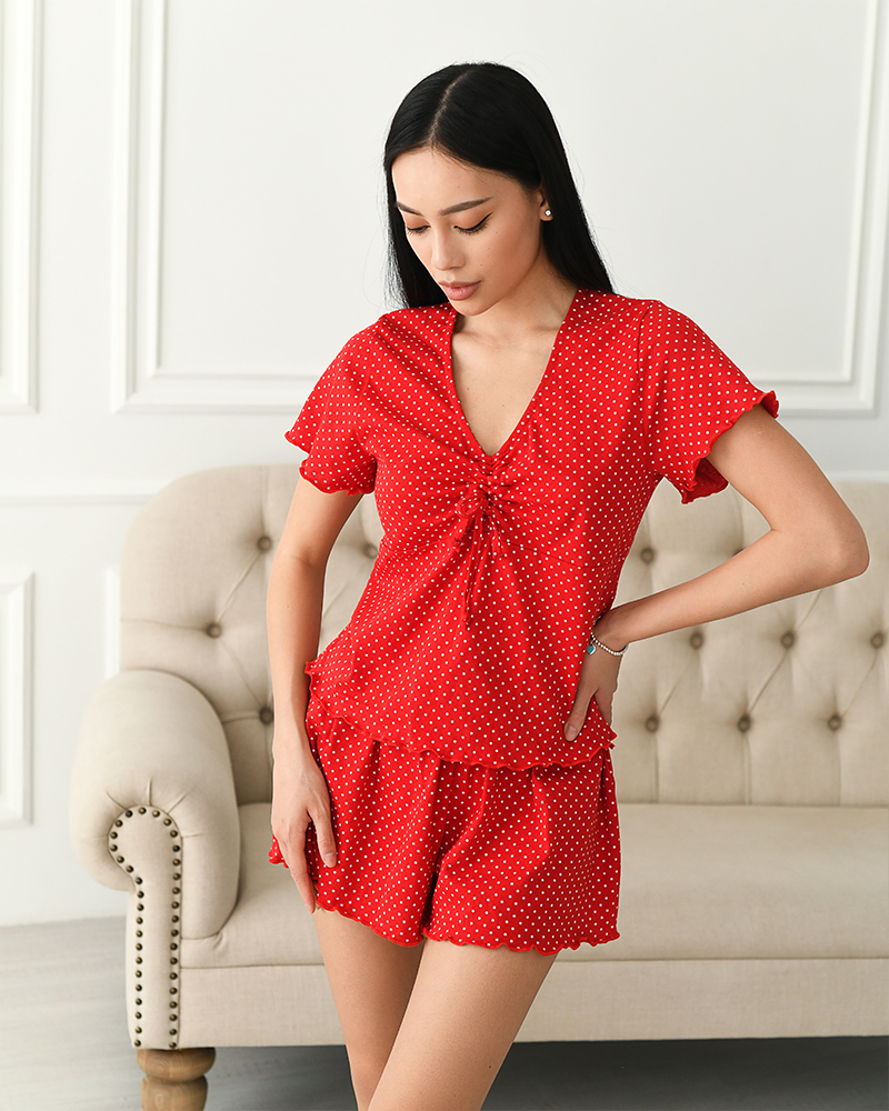 Затишна піжама з віскози складається з футболки зі зборкою на грудях та вільних шортів на резинці.