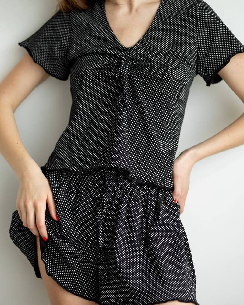 Затишна піжама з віскози складається з футболки зі зборкою на грудях та вільних шортів на резинці.