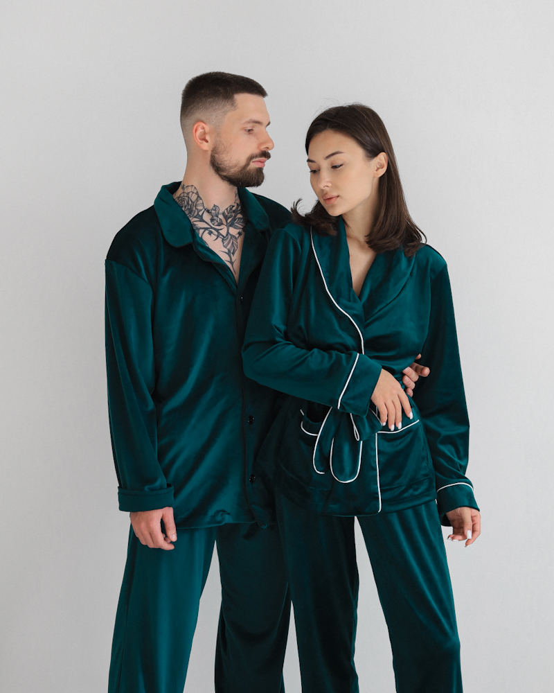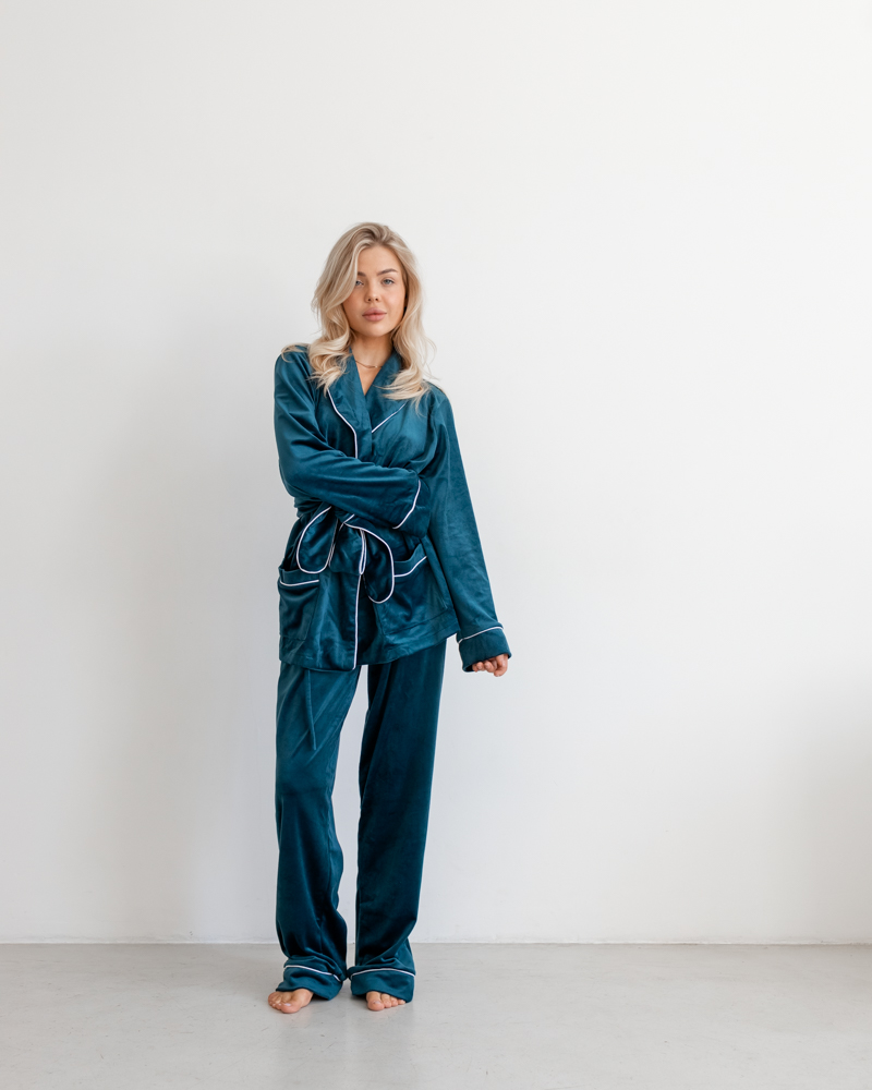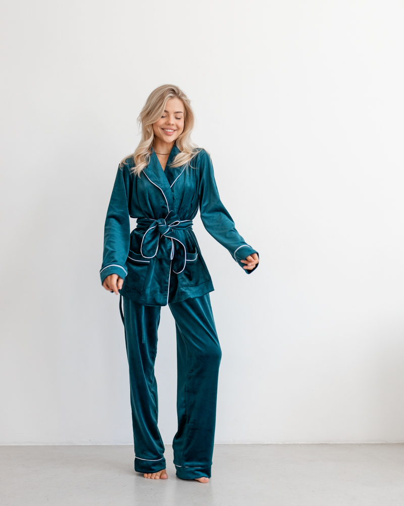 Комплект: Штани + Сорочка. Класичні штани вільного крою з резинкою на талії та кишенями. Сорочка з поясом на запах, всередині на зав'язках.