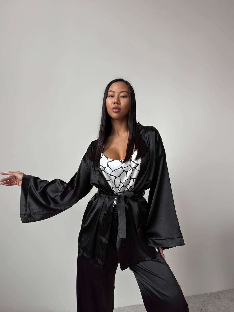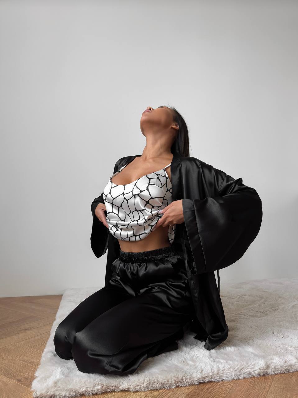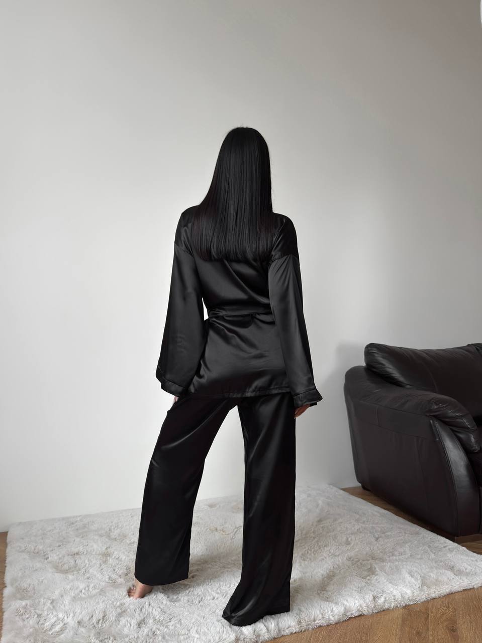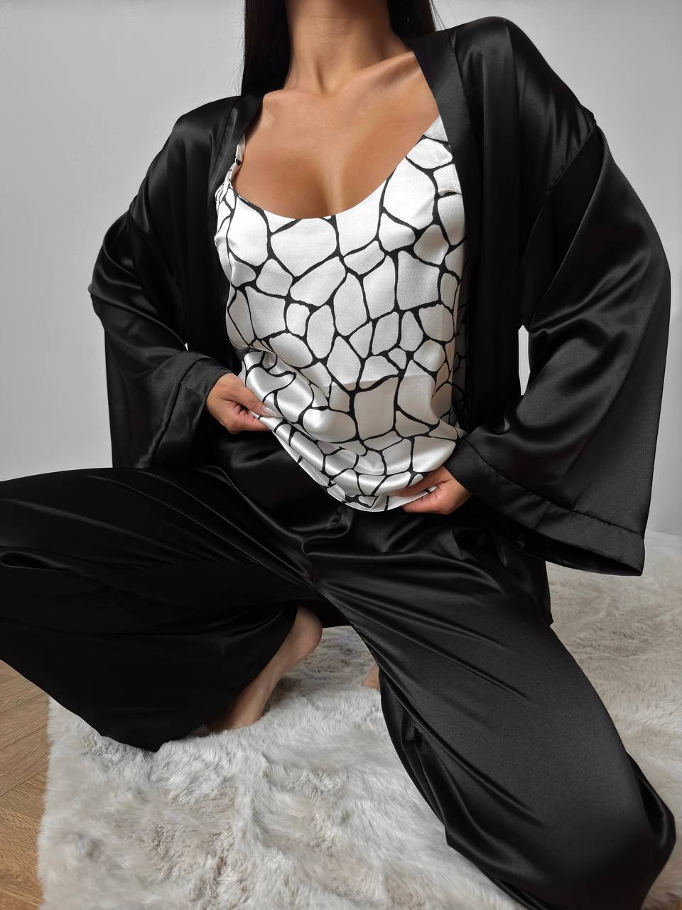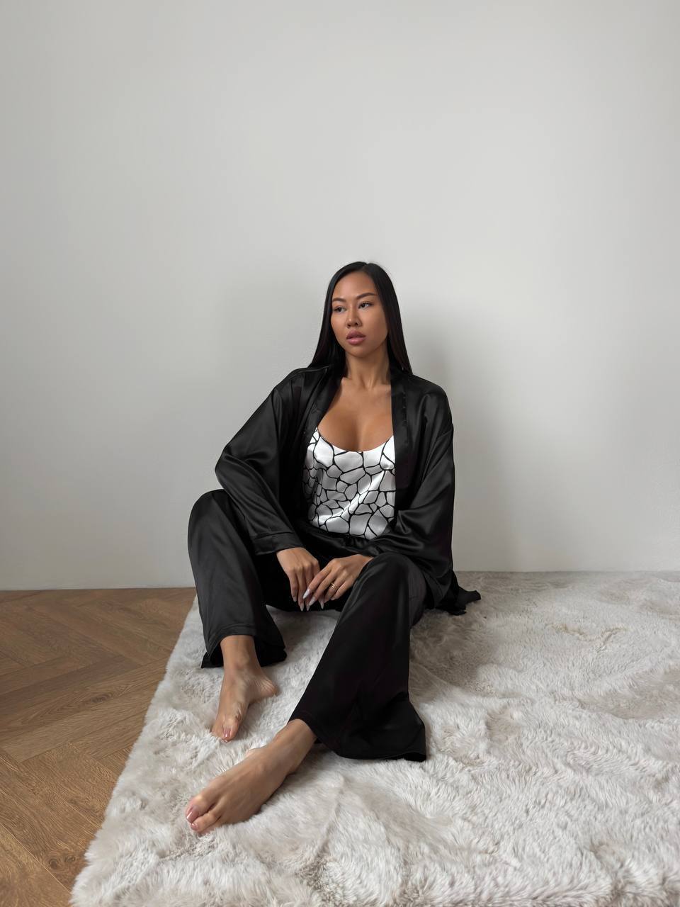 Сатинова піжама включає в себе три елементи: вільні широкі штани з кишенями та еластичною талією, класичну сорочку з довгими рукавами з прикрашену поясом, а також легку майку на тонких бретелях.