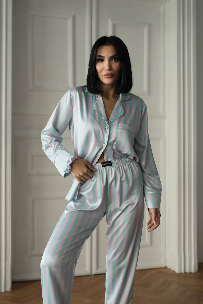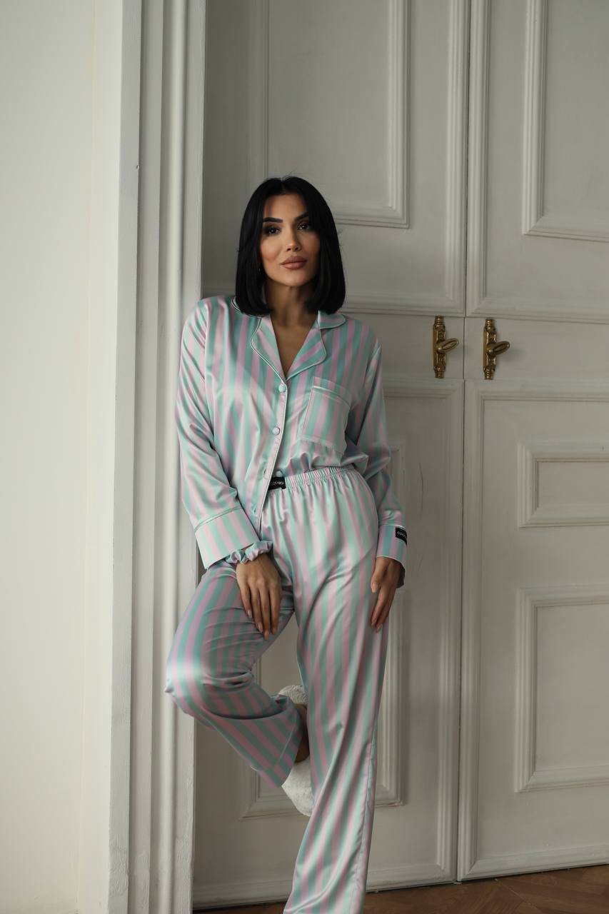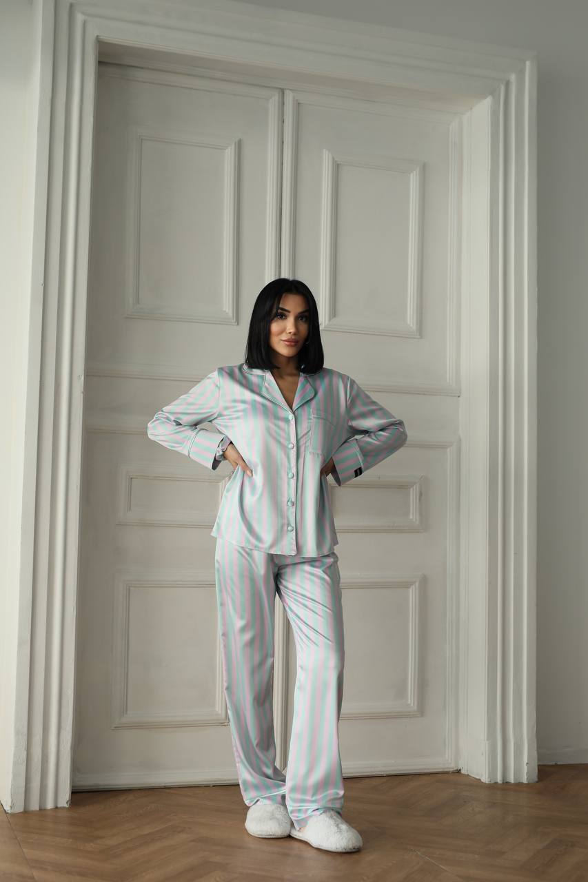 Зустрічайте ранок у стильній і комфортній піжамі! Легка шовковиста тканина ніжно огортає тіло, даруючи максимальний комфорт. Витончений принт у вигляді вертикальних смуг у біло-рожево-м’ятних відтінках додає образу ніжності та елегантності.