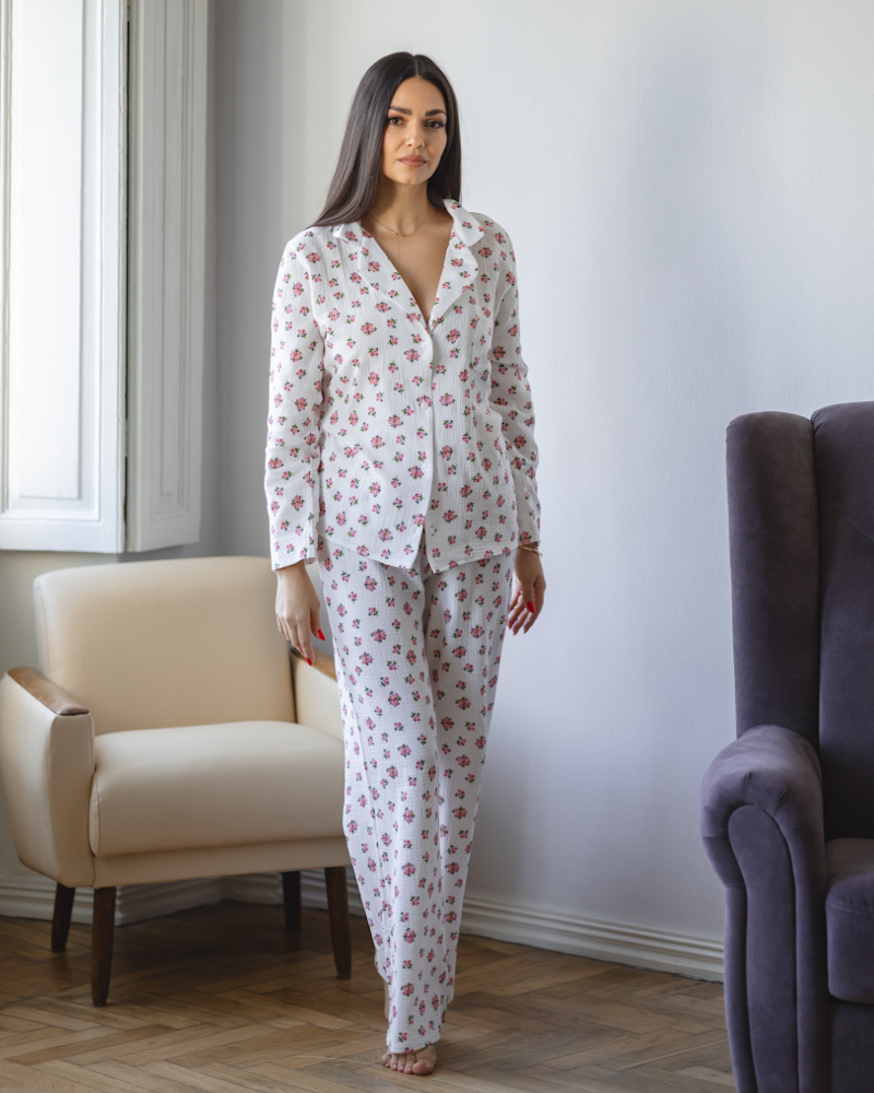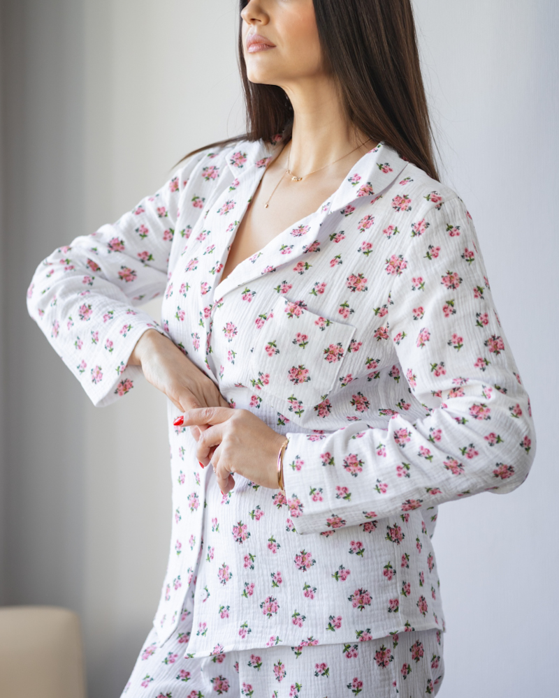 Ніжний та комфортний костюм із сорочкою та штанами у квітковий принт.