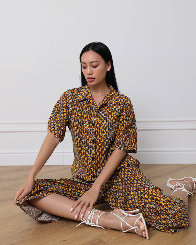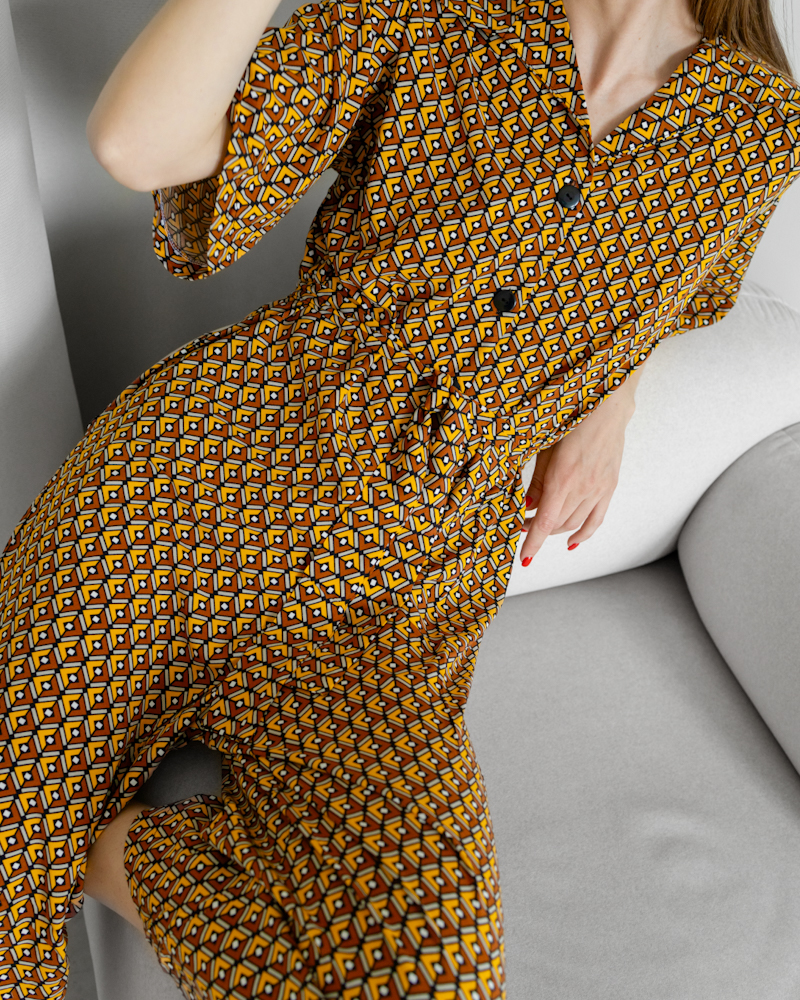 Рукав 3/4, короткі вільні штани, верх оздоблений ґудзиками і поясом на талії, що чудово пікреслює фігуру.