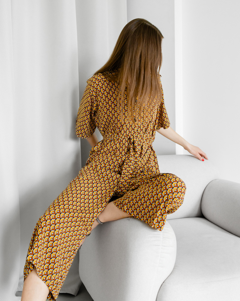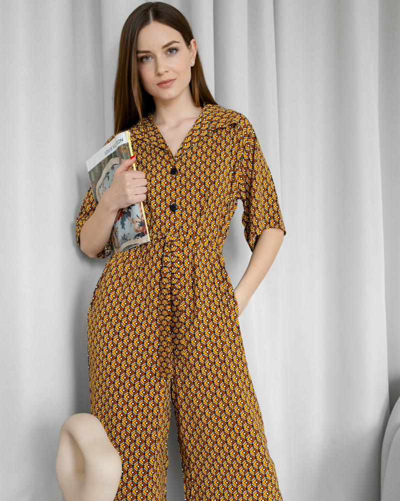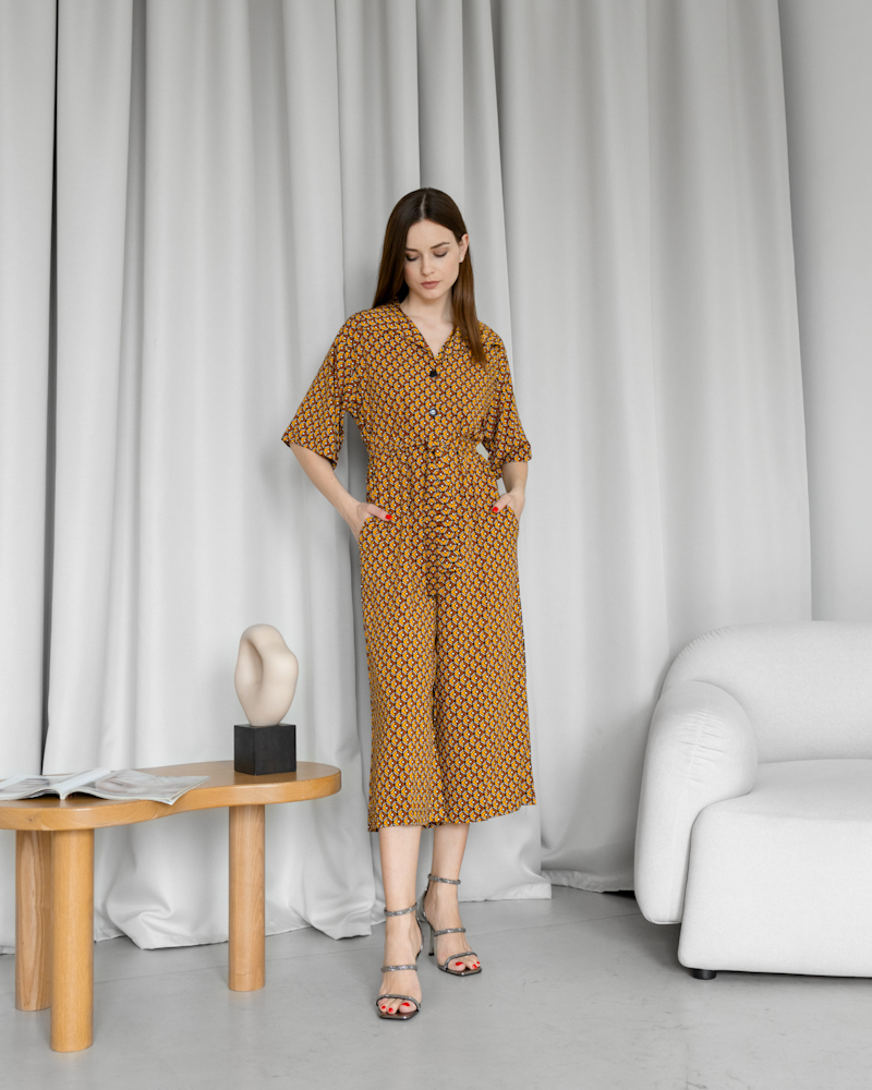 Рукав 3/4, короткі вільні штани, верх оздоблений ґудзиками і поясом на талії, що чудово пікреслює фігуру.
