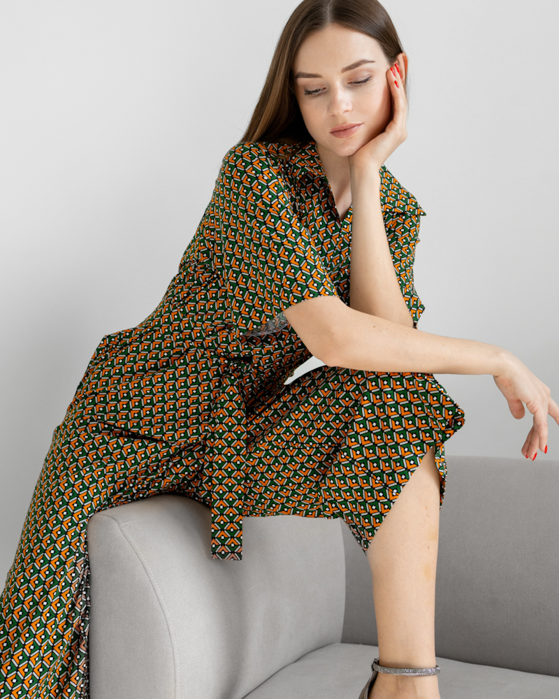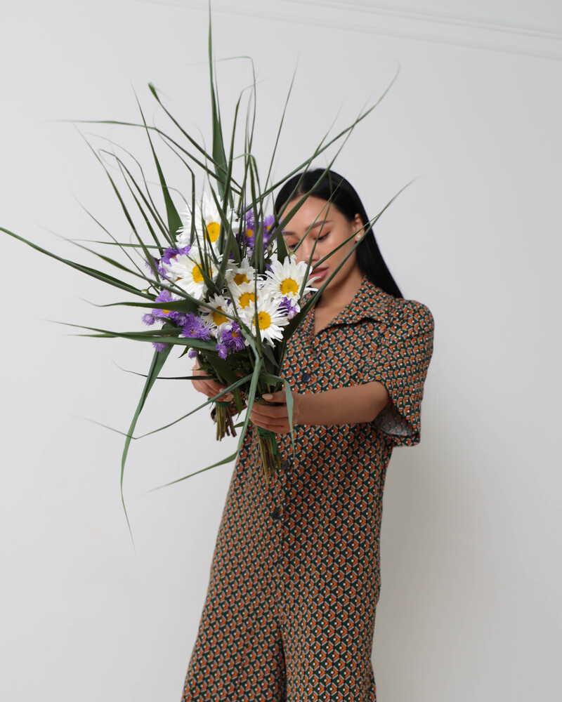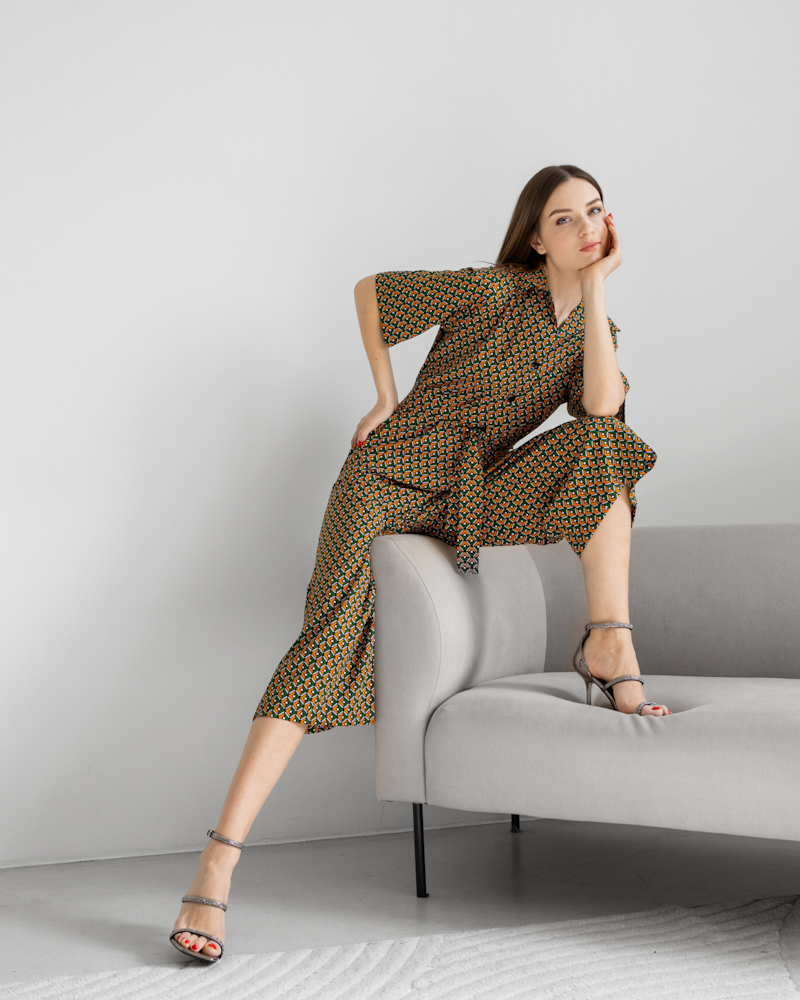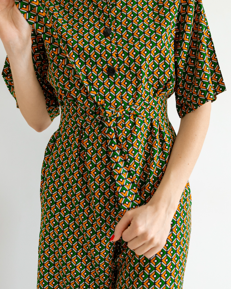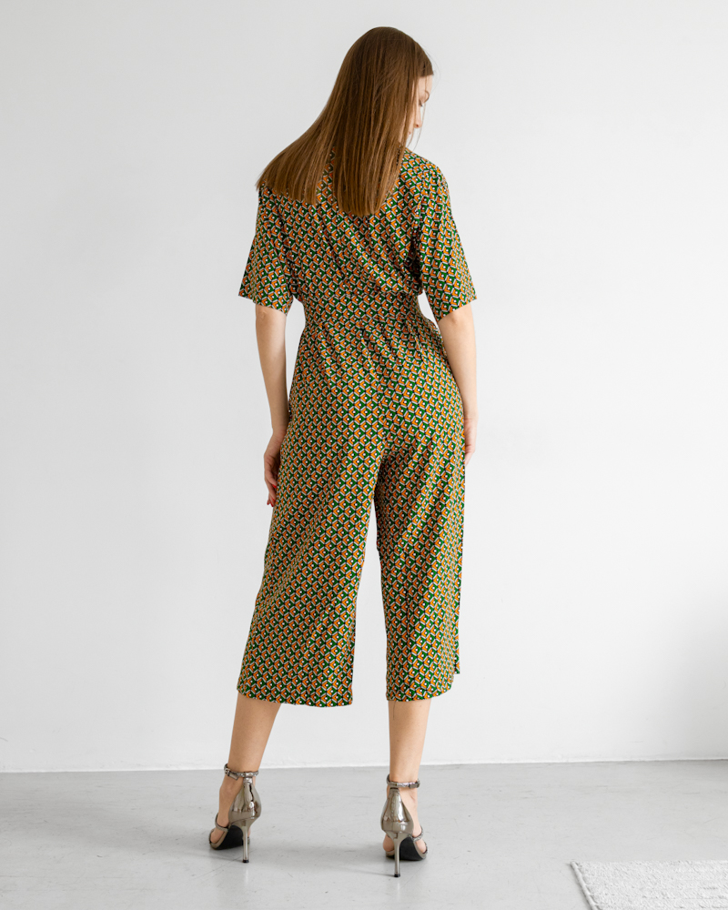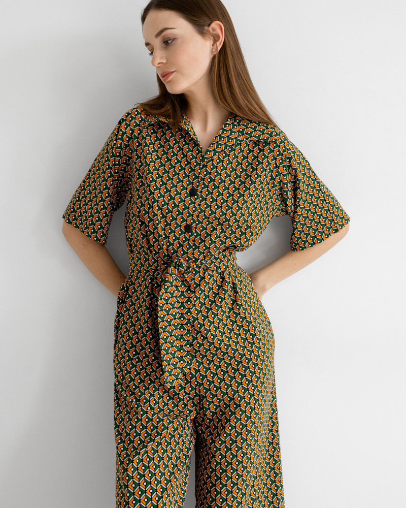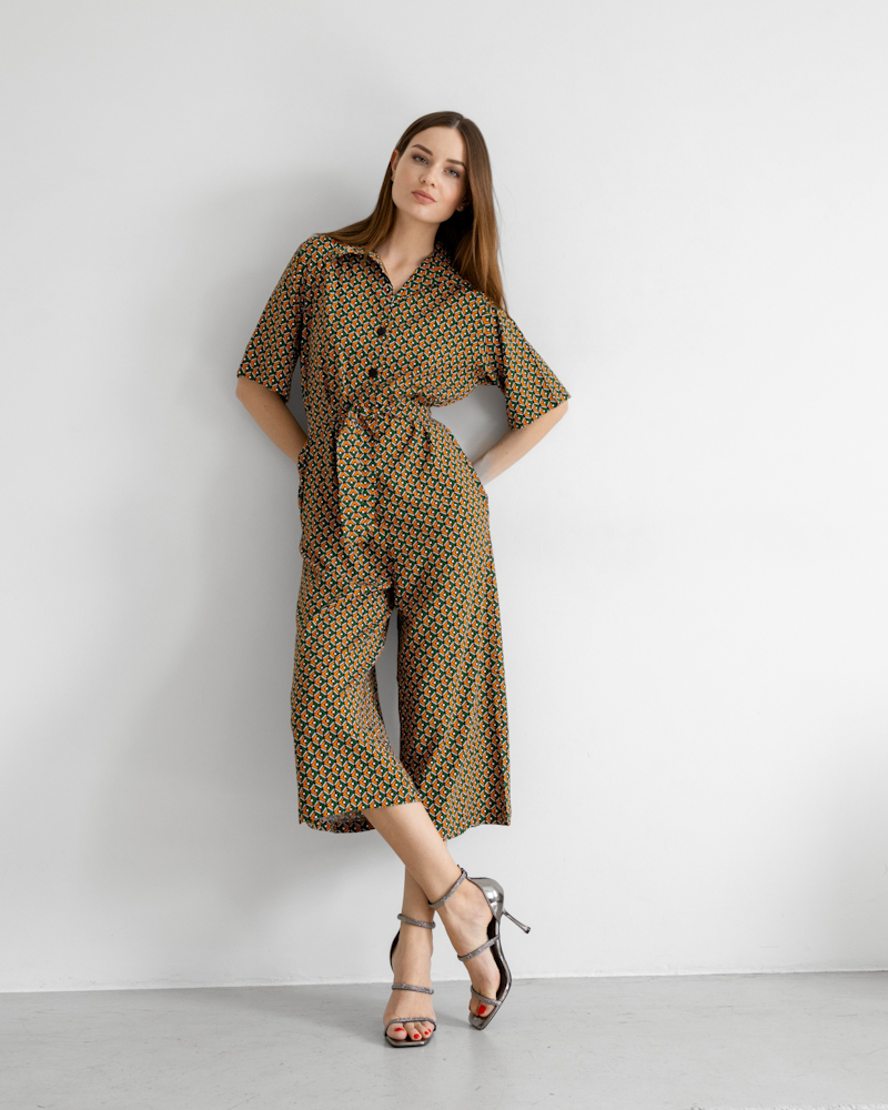 Рукав 3/4, короткі вільні штани, верх оздоблений ґудзиками і поясом на талії, що чудово пікреслює фігуру.