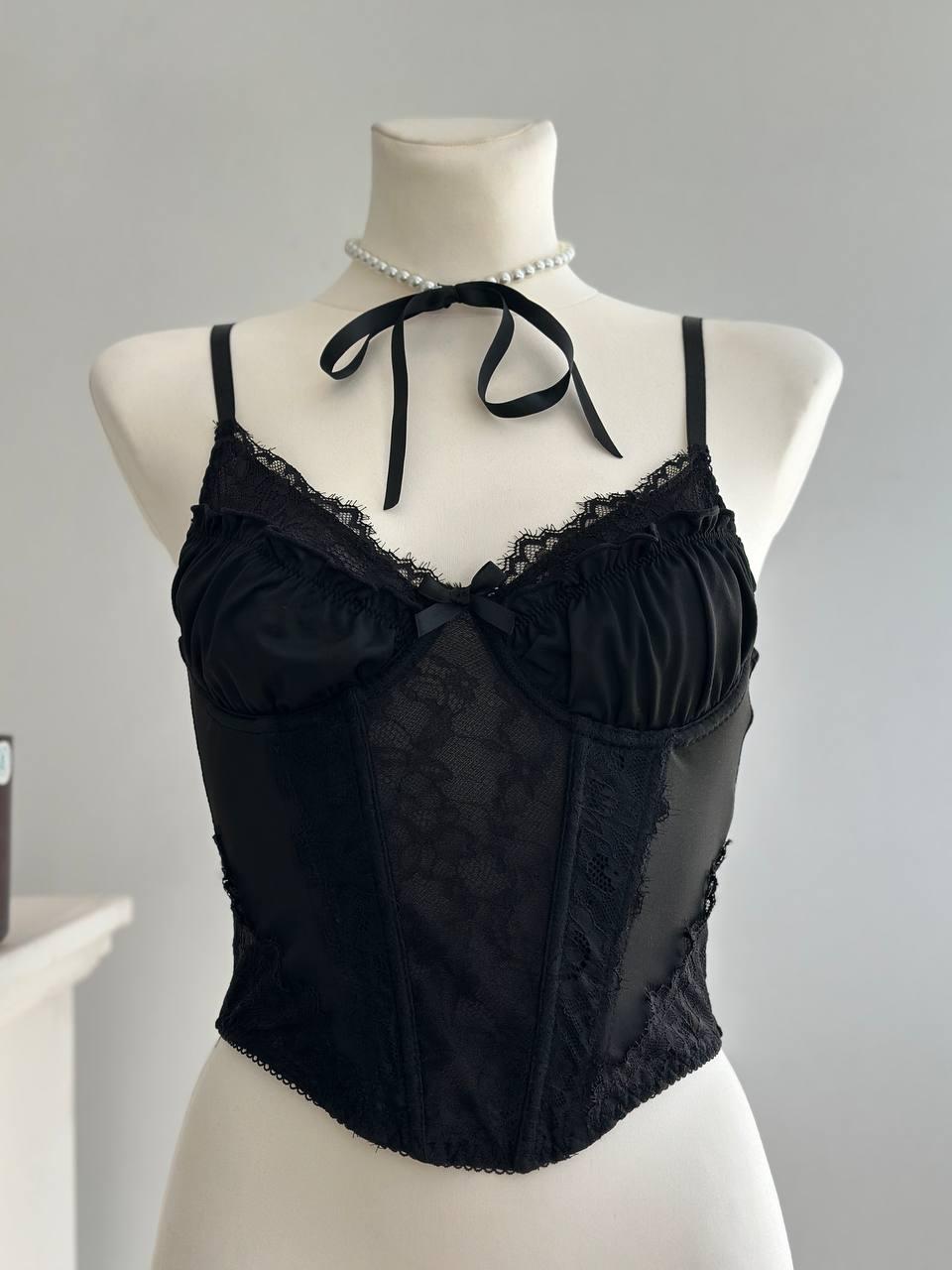 Чорний корсет з мереживом, який формує чіткий силует і додає образу глибини та характеру