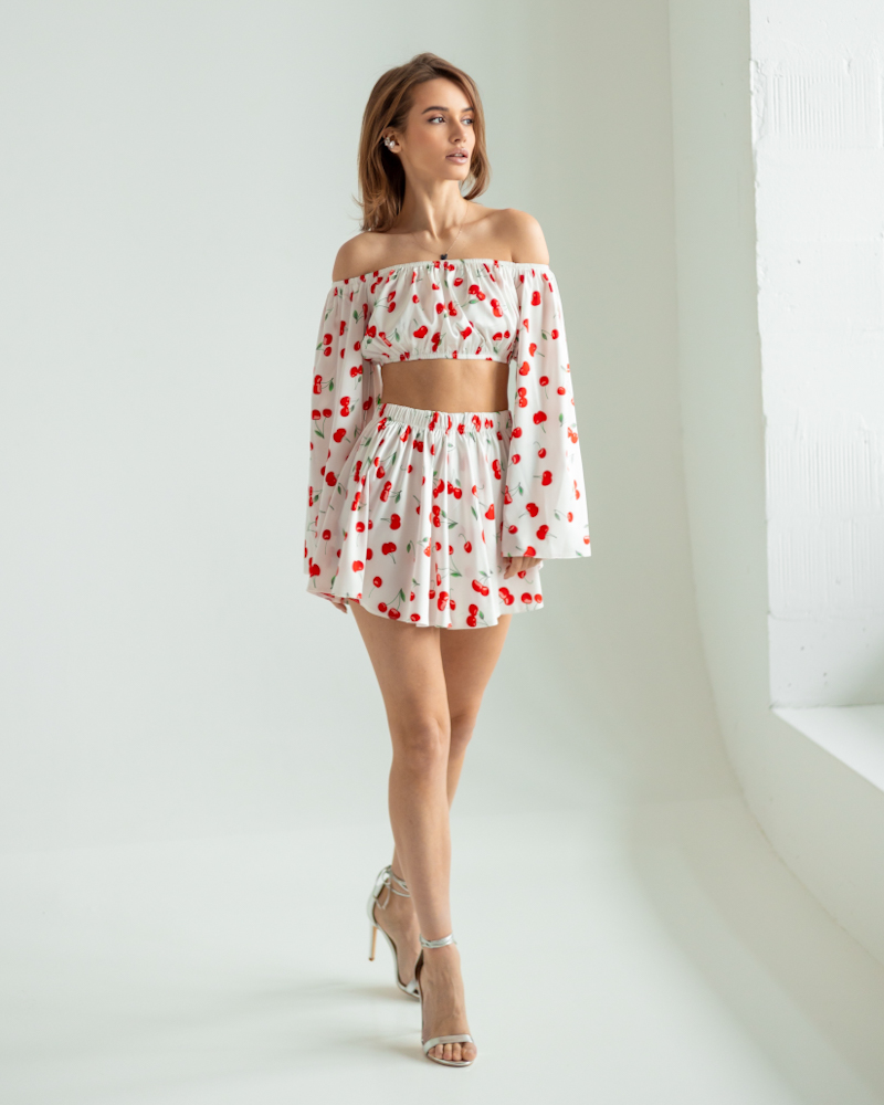Блуза з відкритими плечима та об’ємними рукавами створює жіночний акцент, а спідниця-шорти з високою посадкою та еластичним поясом формують витончений силует.