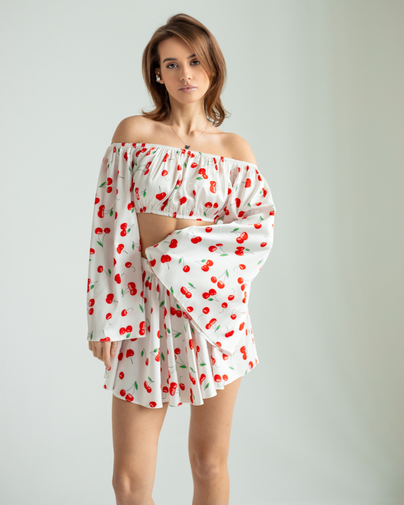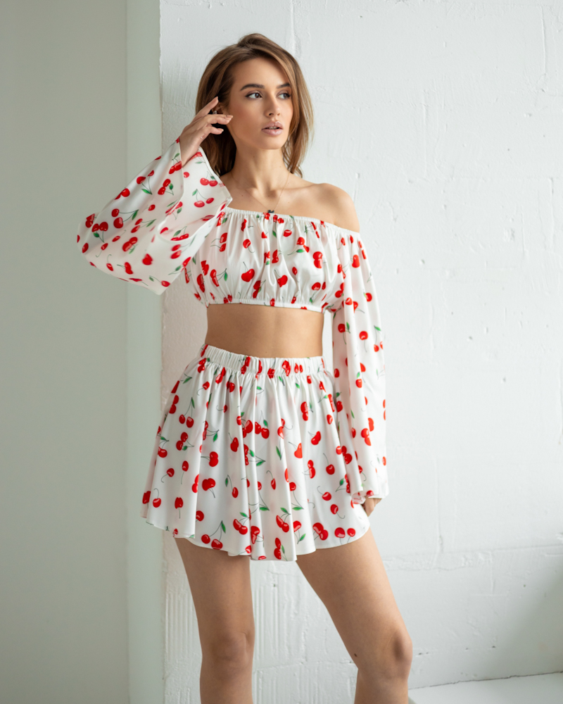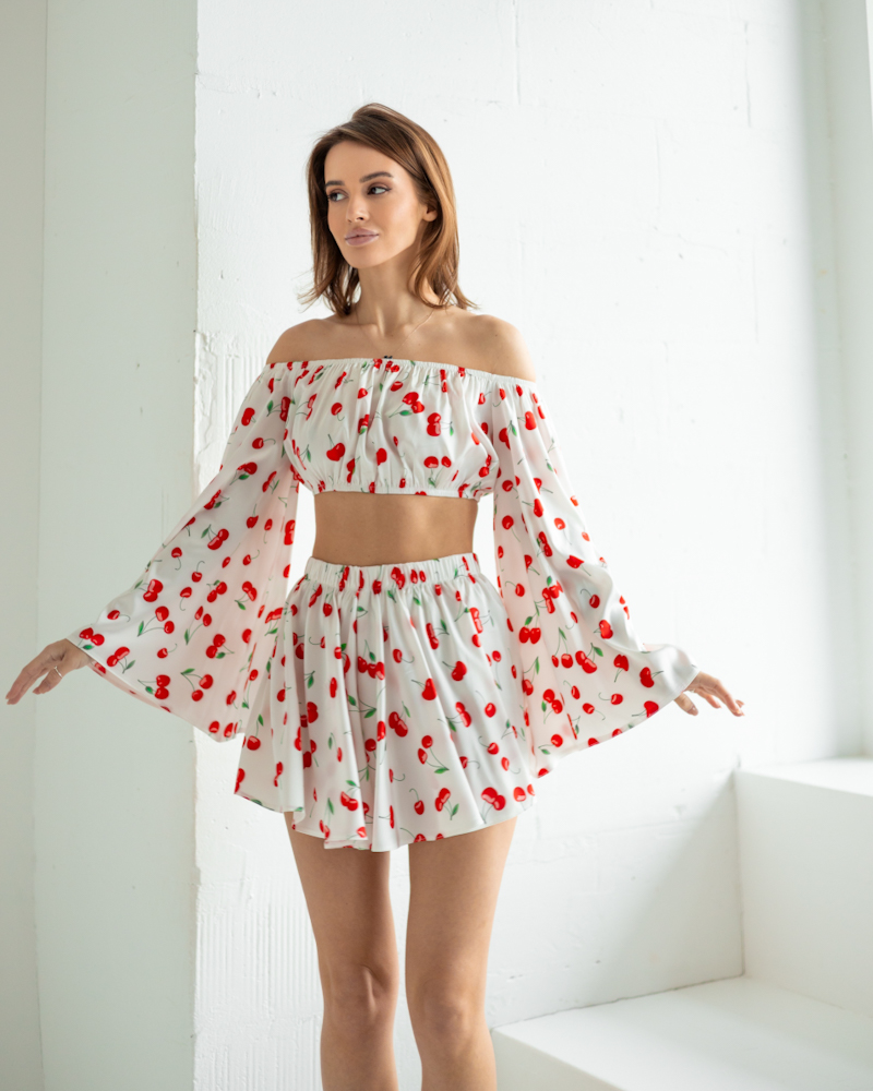Жіночий костюм "Cherry" (блуза+спідниця-шорти) італійський шовк Вишні на білому