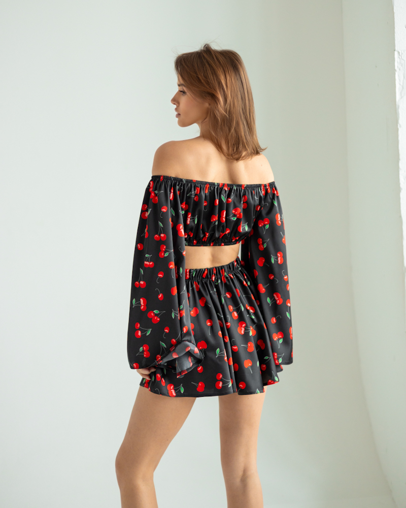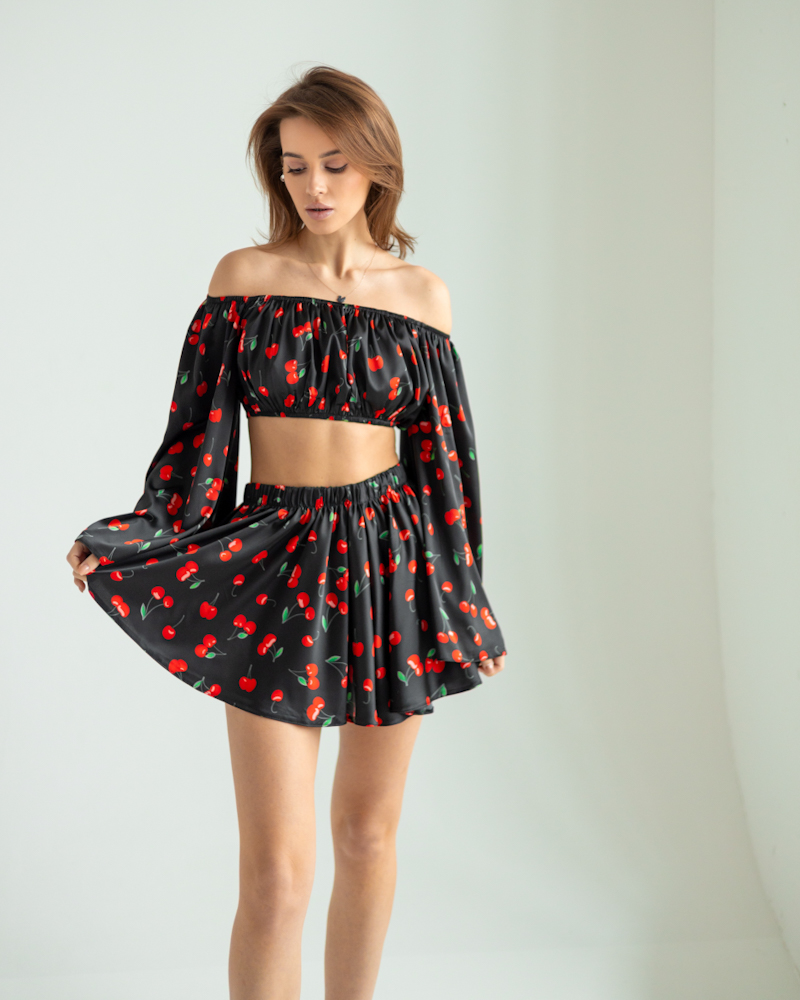 Ефектний жіночий комплект в чорному кольорі з яскравим принтом вишень.