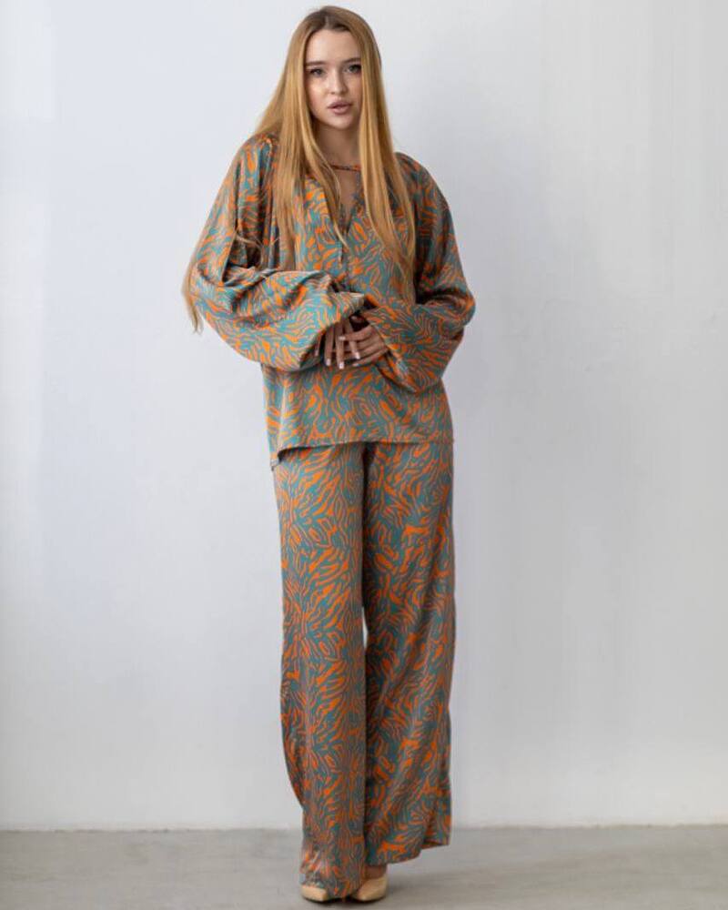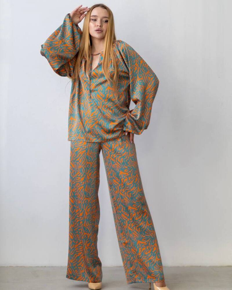 Комплект: блуза із довгим рукавом-ліхтариком із зав'язкою на грудях та вільного крою штани-кльош із кишенями.