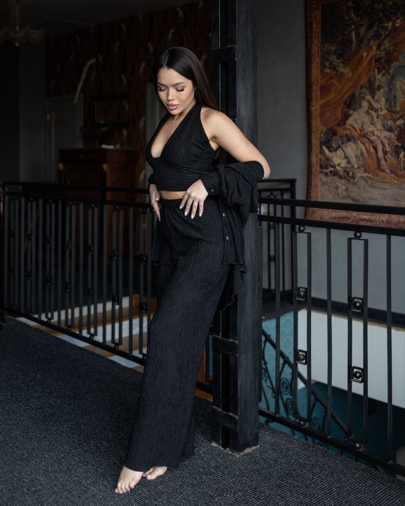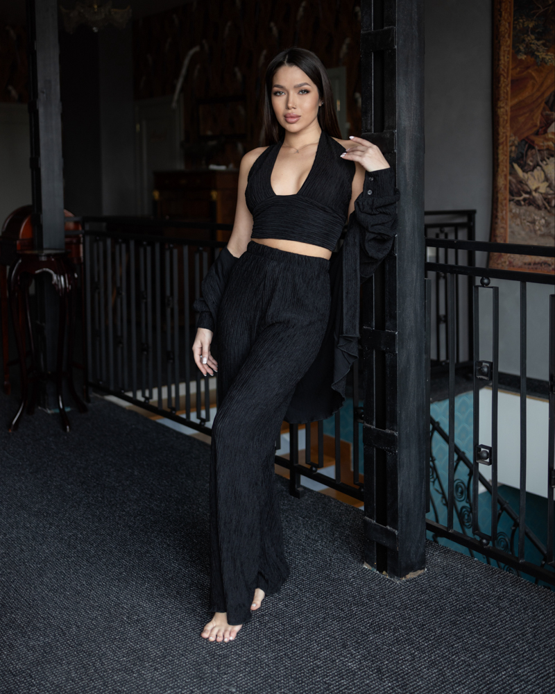 Жіночий костюм-трійка "Dominica" (сорочка+топ+штани) віскоза жатка Чорний 4281 QC фото - Luxbikini