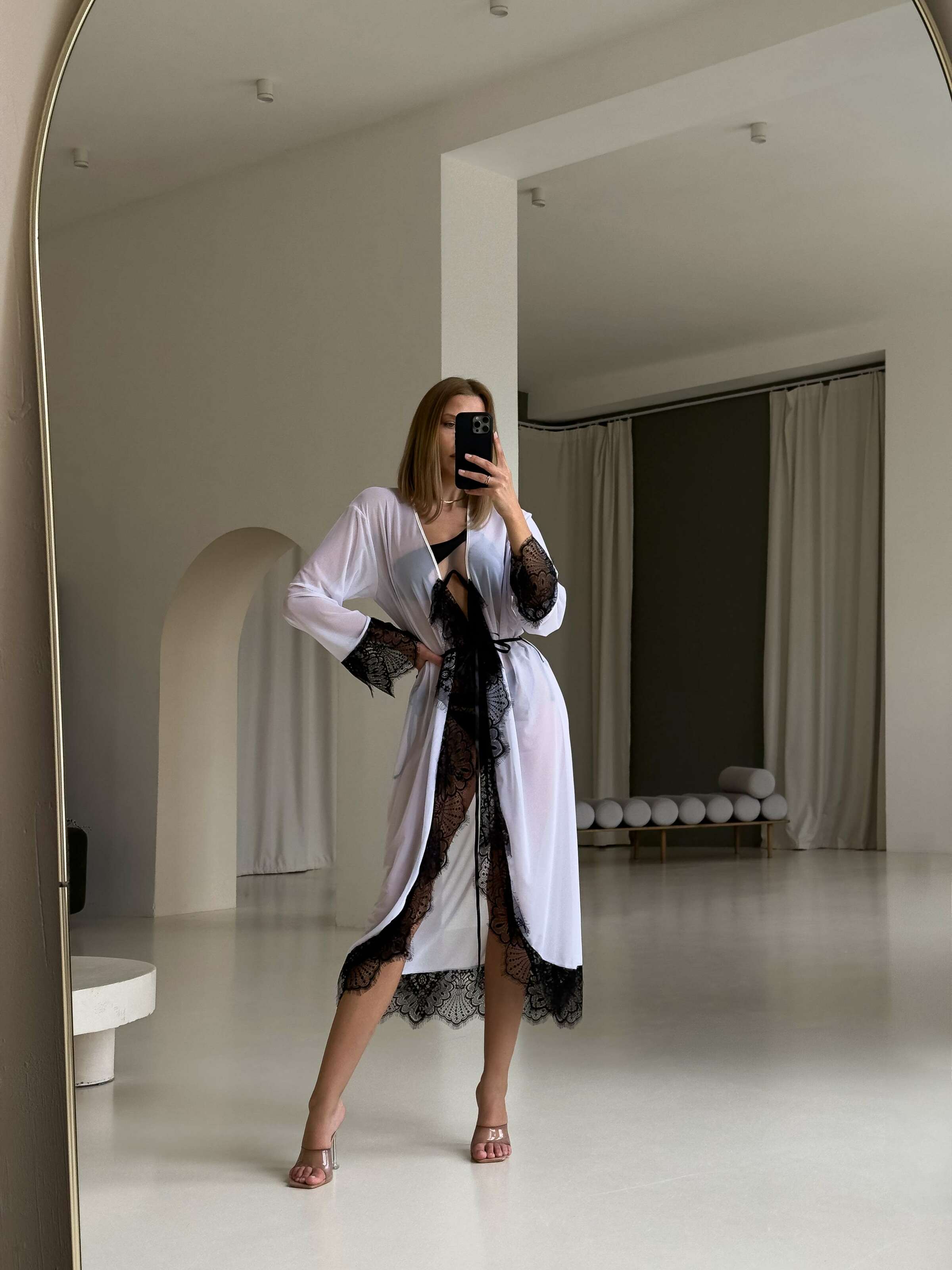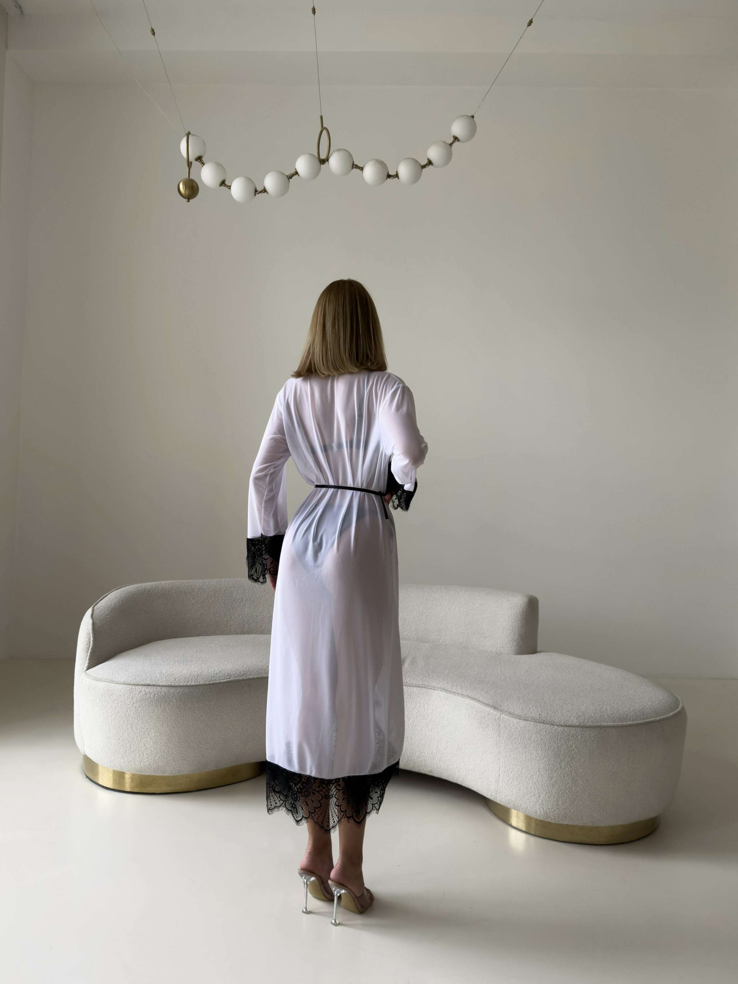 Легка прозора накидка в білому кольорі з ніжним мереживом — вишукане доповнення до купальника. Парео має елегантну довжину та акцентні чорні мереживні вставки на рукавах і подолі. Зав’язується поясом на талії, гарно підкреслюючи силует.