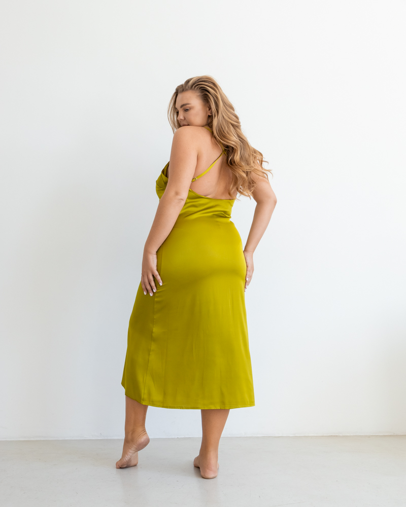 Модель представлена в довжині міді з відкритою спиною, бретелі регулюються.
