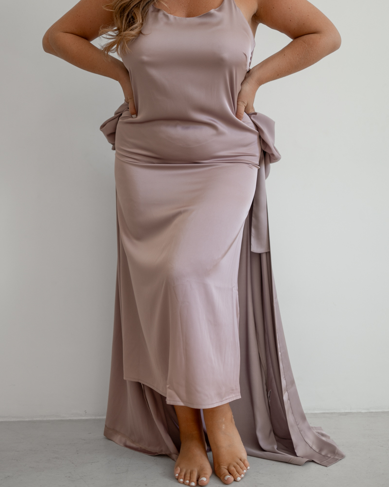 Модель представлена в довжині міді з відкритою спиною, бретелі регулюються.