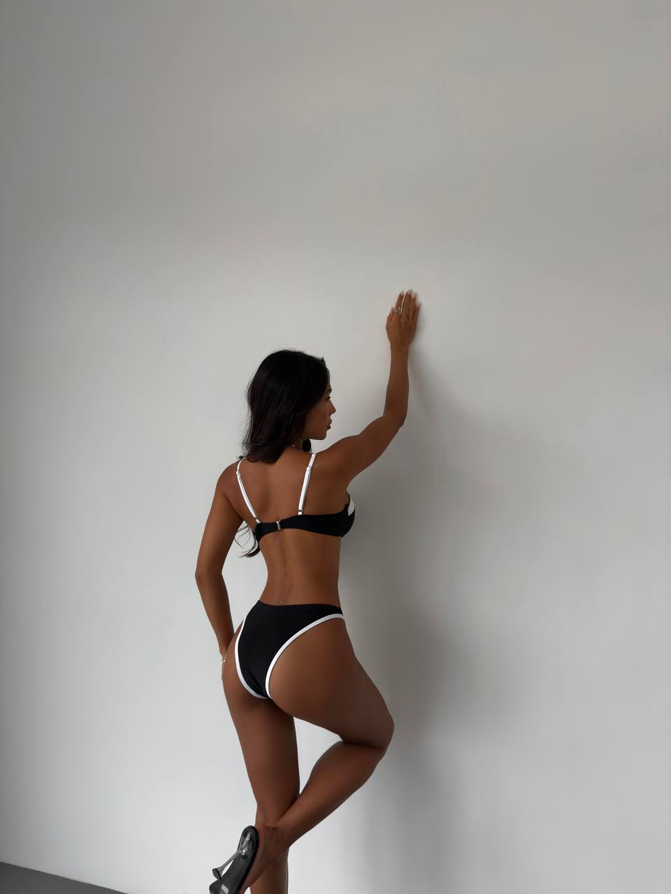 Ефектний контрастний купальник у класичному поєднанні чорного та білого кольорів. Бюстгальтер із гарно підкреслює декольте, а високі трусики візуально подовжують ноги та роблять силует стрункішим. Ідеальний вибір для стильного пляжного відпочинку.