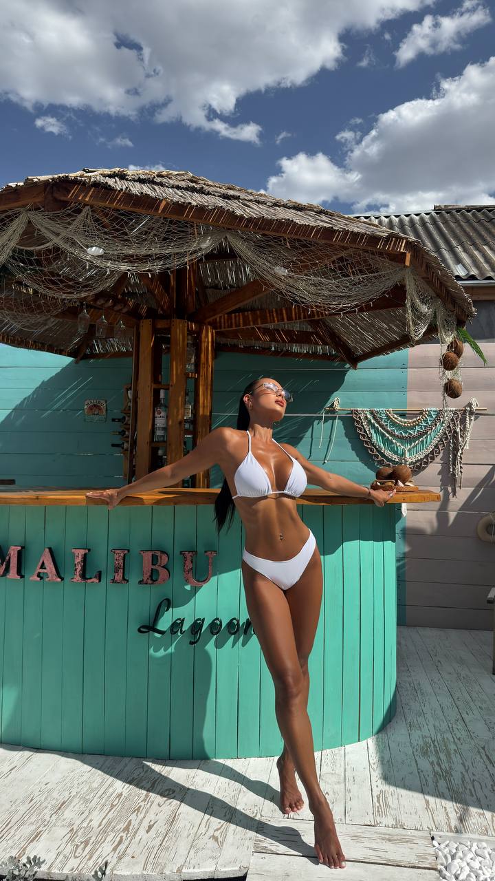 Стильний літній комплект, що складається з білого купальника-трикутника та легкої прозорої накидки у вигляді мінісукні.