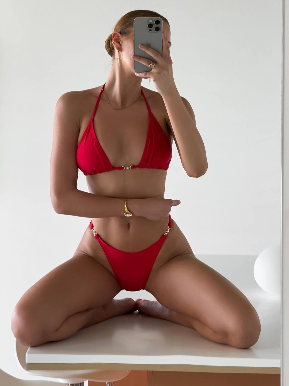 Розкішний бікіні з елегантними деталями. Верх із трикутними чашечками має регульовані зав’язки на шиї та спині, забезпечуючи ідеальну посадку. Нижня частина купальника — з високою посадкою, що візуально подовжує ноги та підкреслює талію. Елегантні декоративні вставки з металевими елементами додають образу вишуканості. Чашка має зйомні паралонові вкладиші.