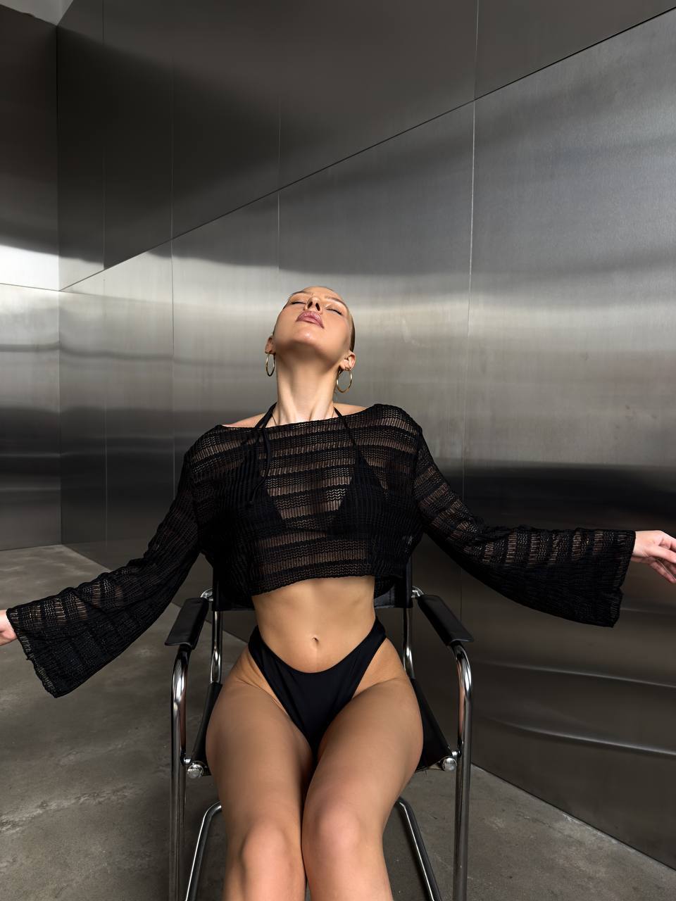 Легка сітчаста накидка додає образу шарму — вона напівпрозора, має широкі рукави та злегка вкорочений крій.