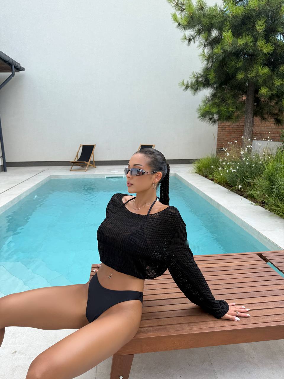 Цей комплект створений для тих, хто хоче виглядати елегантно й впевнено на пляжі чи біля басейну. Класичний чорний купальник з акцентом на високу талію візуально подовжує ноги та підкреслює силует. Верх на зав’язках чудово тримається та пасує до різних типів фігури.