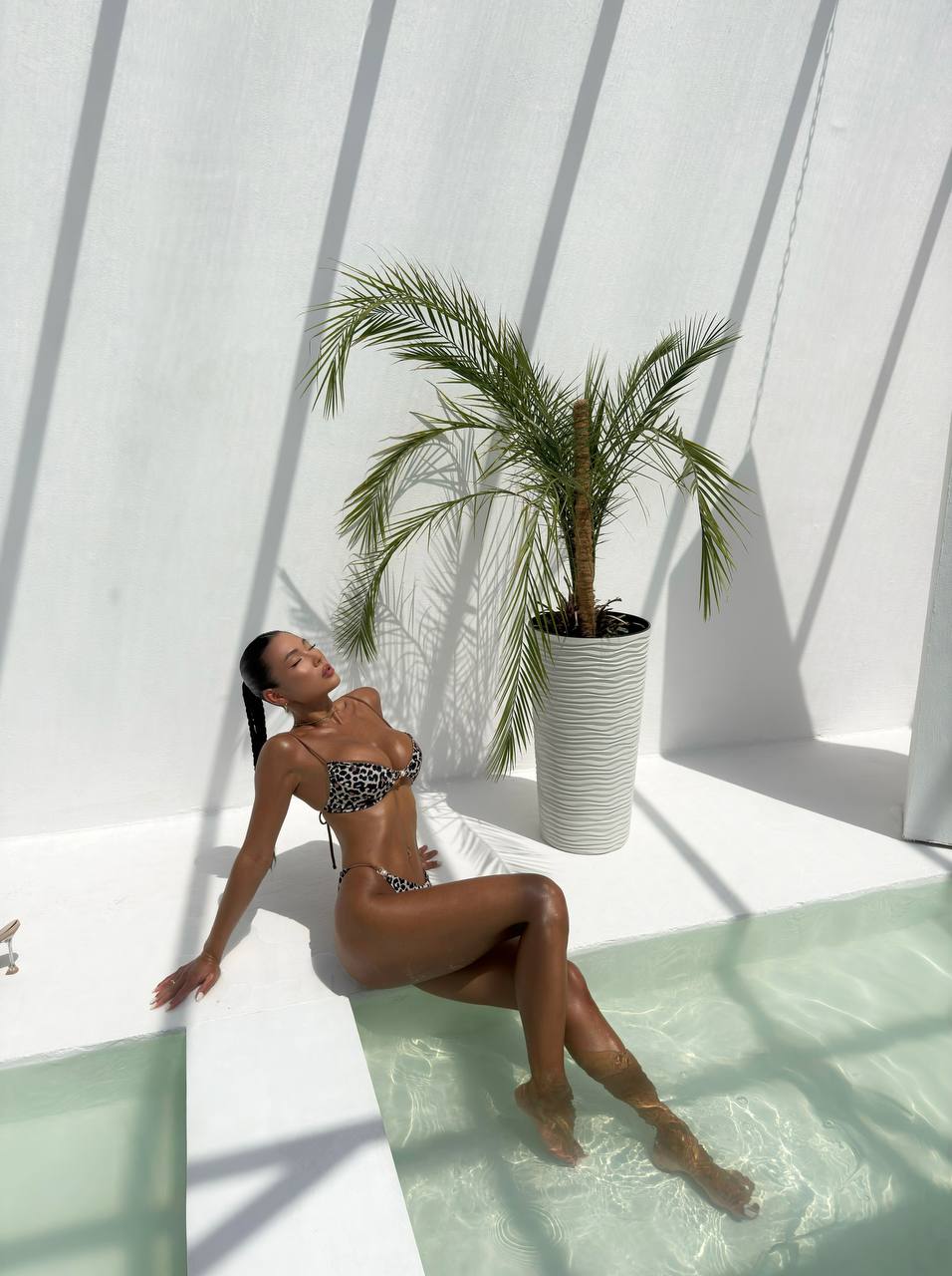 Стильний леопардовий купальник для сміливих та впевнених у собі!Верх із м’якою чашкою на тонких бретелях та елегантною золотою вставкою.Низ — класичні трусики з високим вирізом та декоративними елементами. Ідеальний для засмаги.