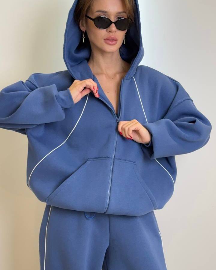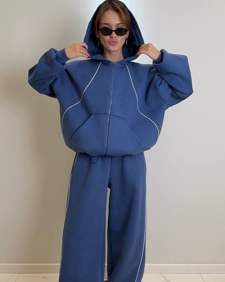 Комплект: вільного крою кофта на блискавці з капюшоном та кишенями, штани-джогери на резинці зі шнурком та кишенями.