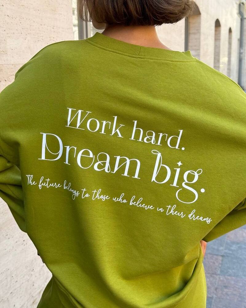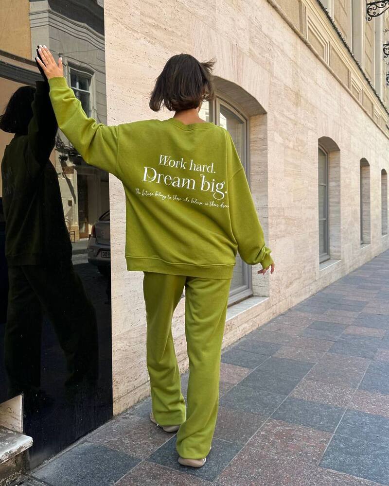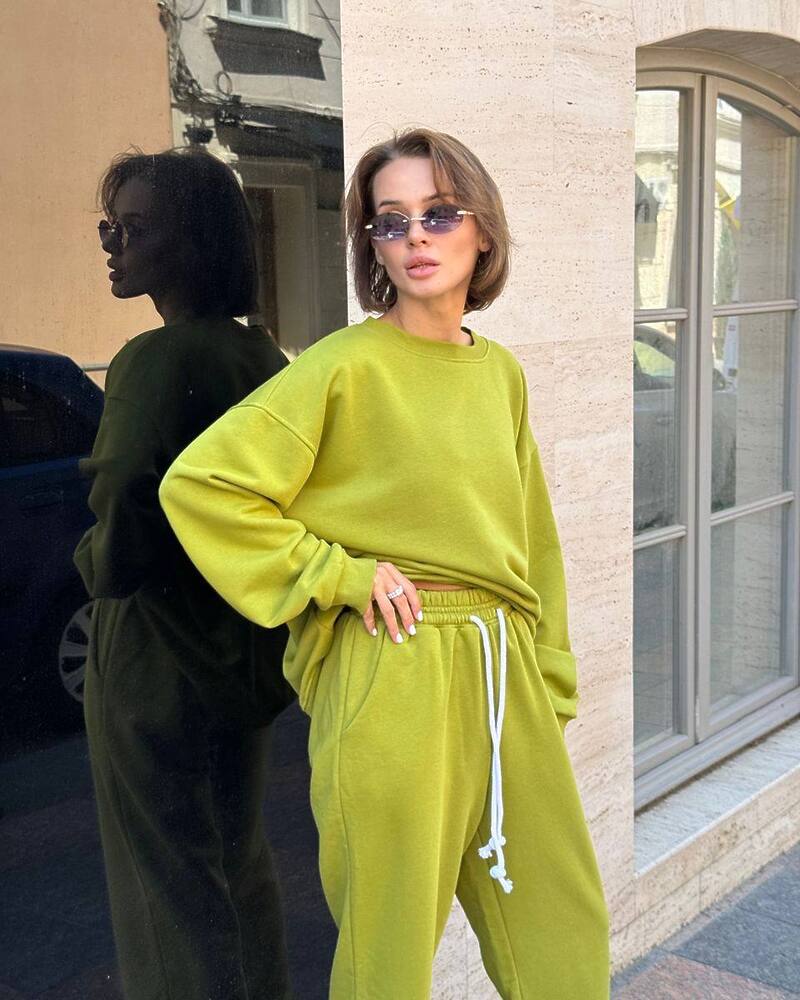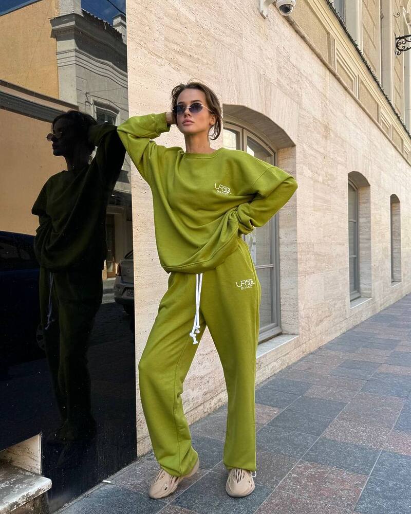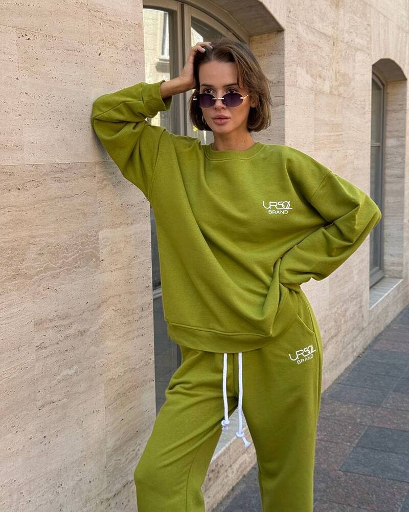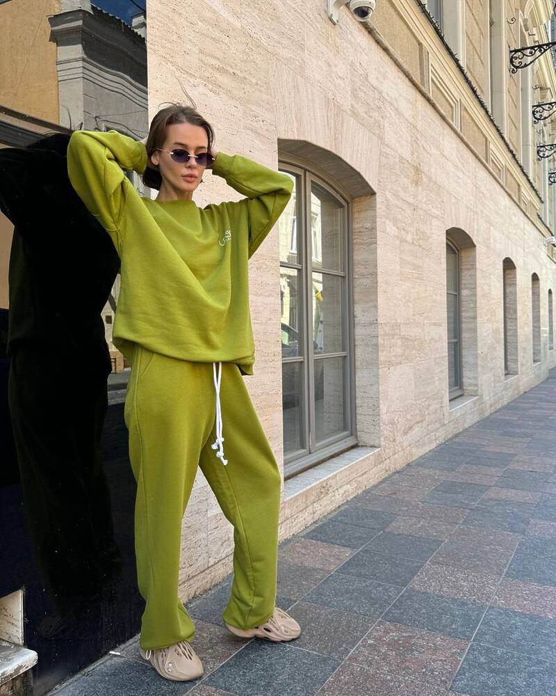 Комплект: вільний світшот із манжетами та прямого крою штани на резинці зі шнурком та кишенями.