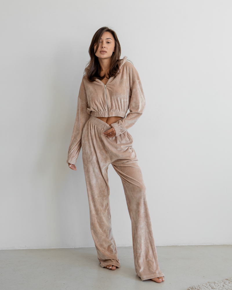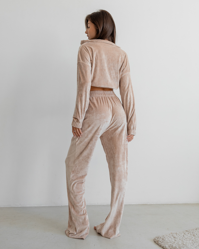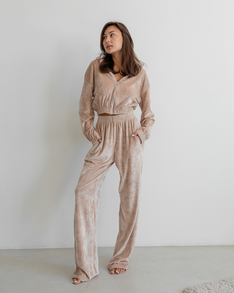 Комплект: укорочена кофтина на блискавці та резинці, штани-палаццо із високою посадкою на резинці.