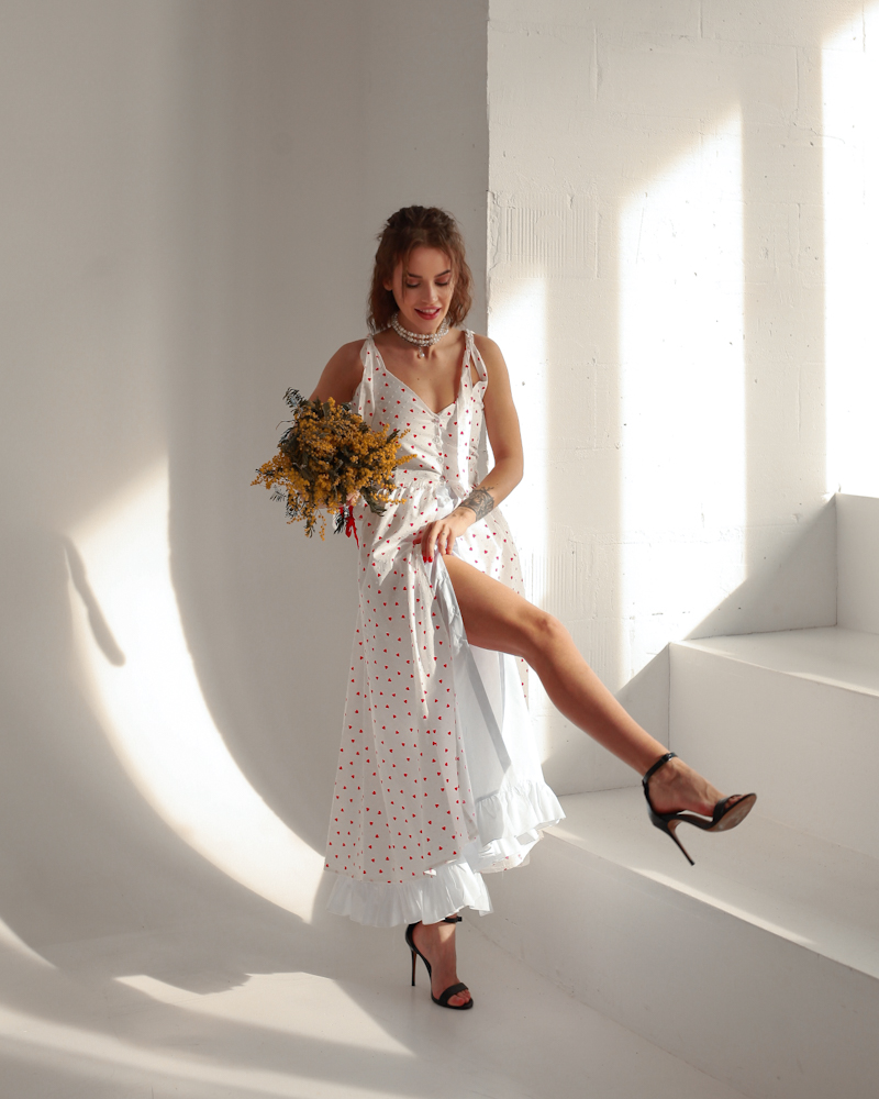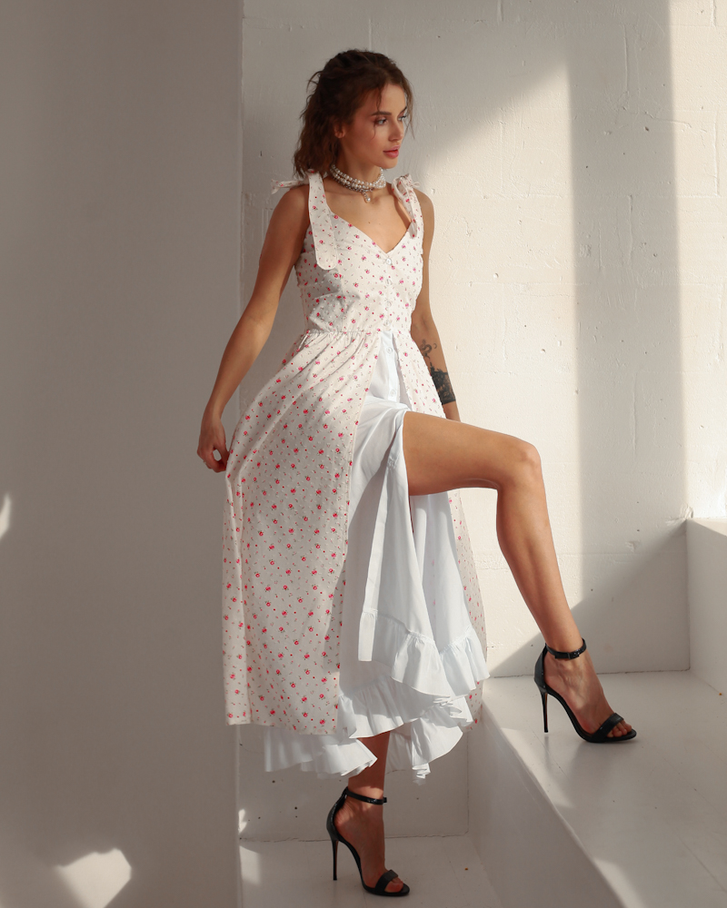 Модель зроблена на ґудзиках, на плечах зав'язки, спідниця має світлий легкий підклад, розріз якого можна регулювати на Ваш смак, низ внутрішнього підкладу оздоблений рюшами.
