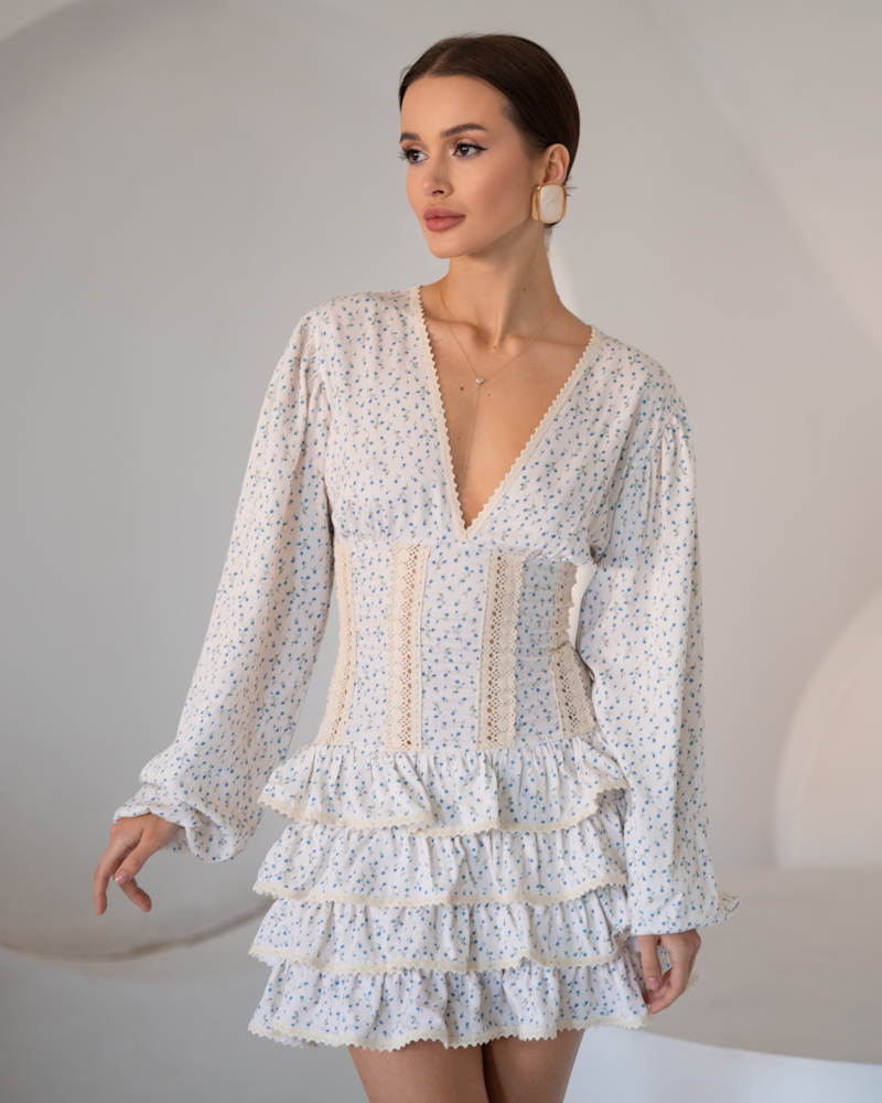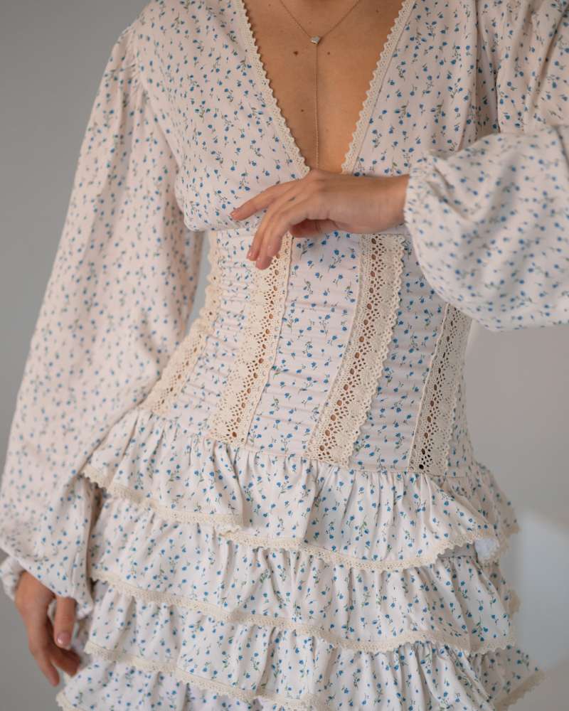 Модель із довгими рукавами-ліхтариками на резинці, на талії імітація корсету із мереживними вертикальними вставками, спідниця зроблена ярусами та прикрашена мереживом.