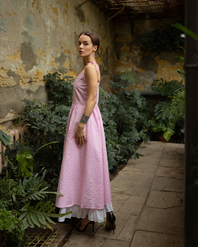Модель зроблена на ґудзиках, на плечах зав'язки, спідниця має світлий легкий підклад, розріз якого можна регулювати на Ваш смак, низ внутрішнього підкладу оздоблений рюшами.