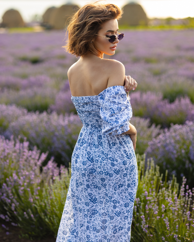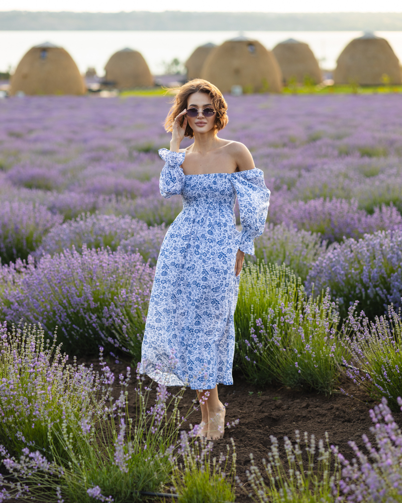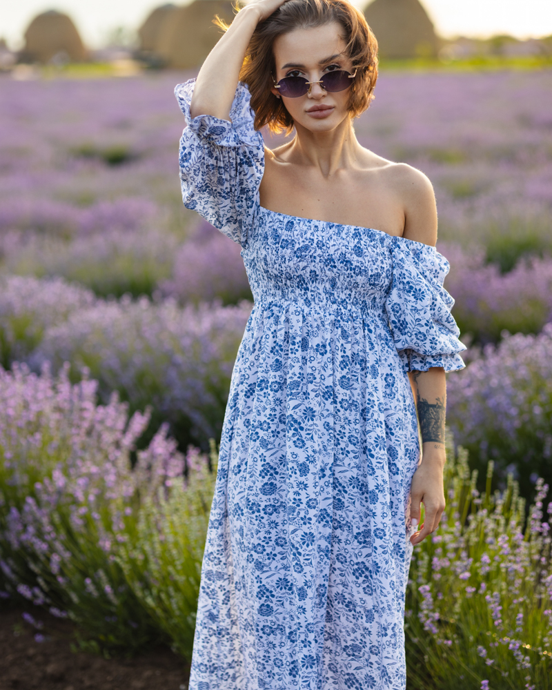 Яскрава літня сукня-міді із рукавами-ліхтариками та резинкою на грудях.