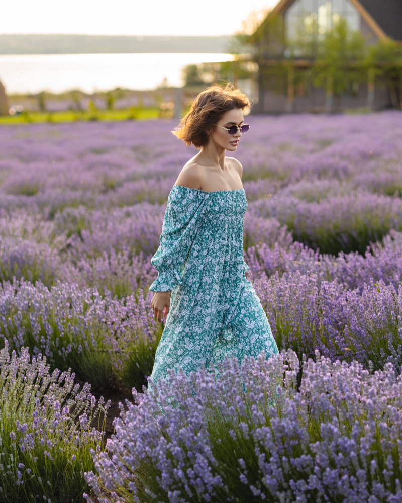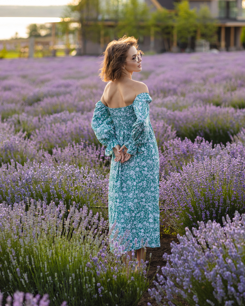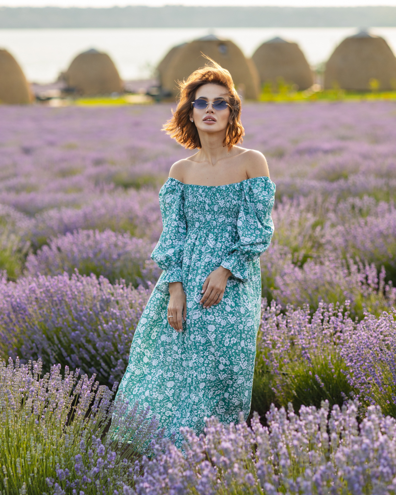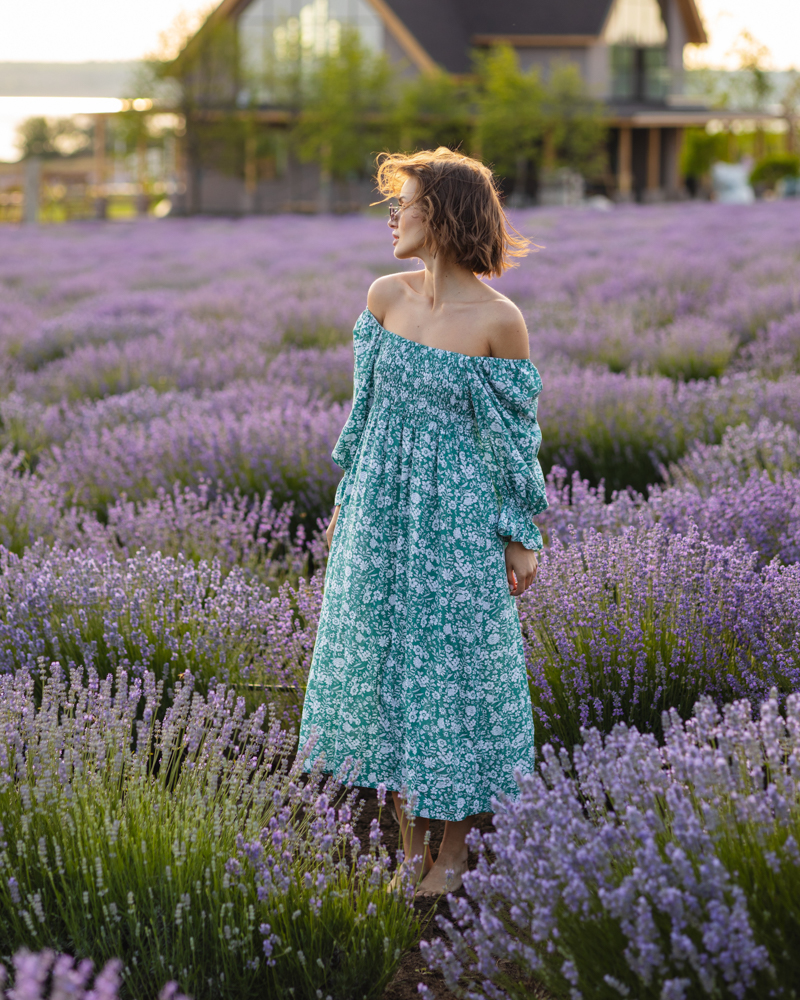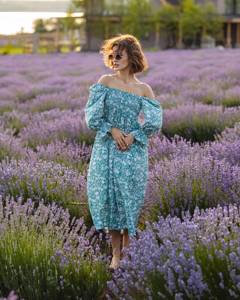 Яскрава літня сукня-міді із рукавами-ліхтариками та резинкою на грудях.