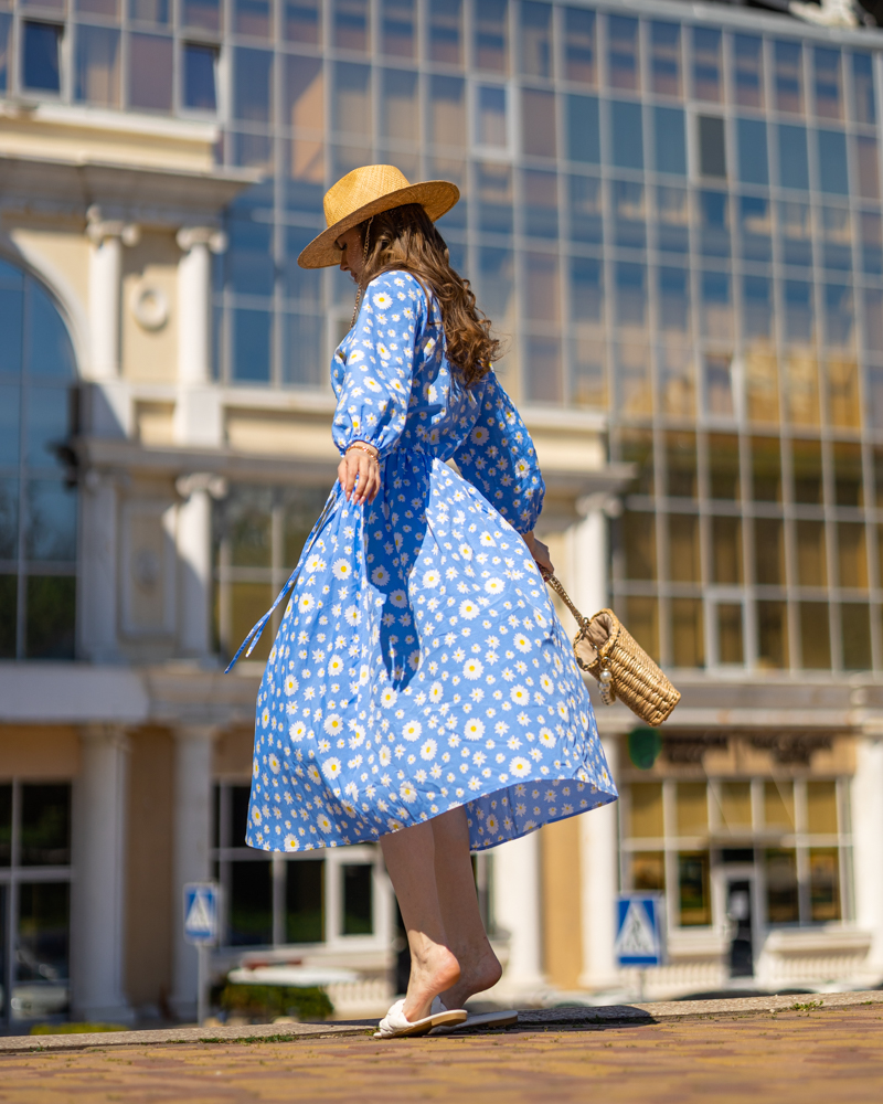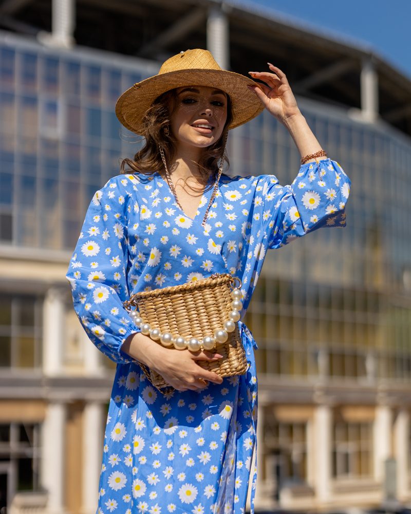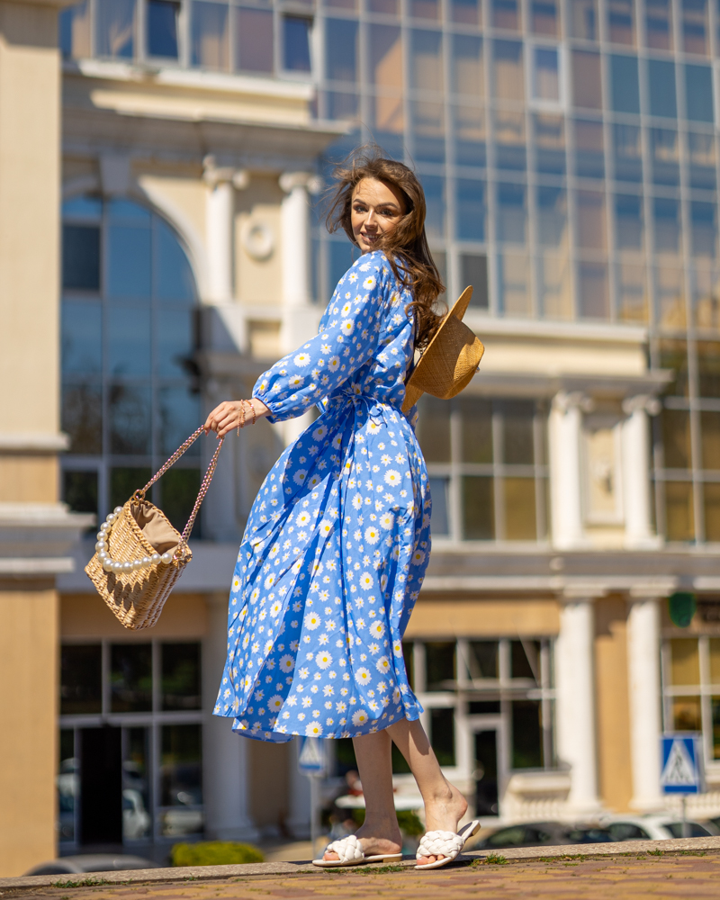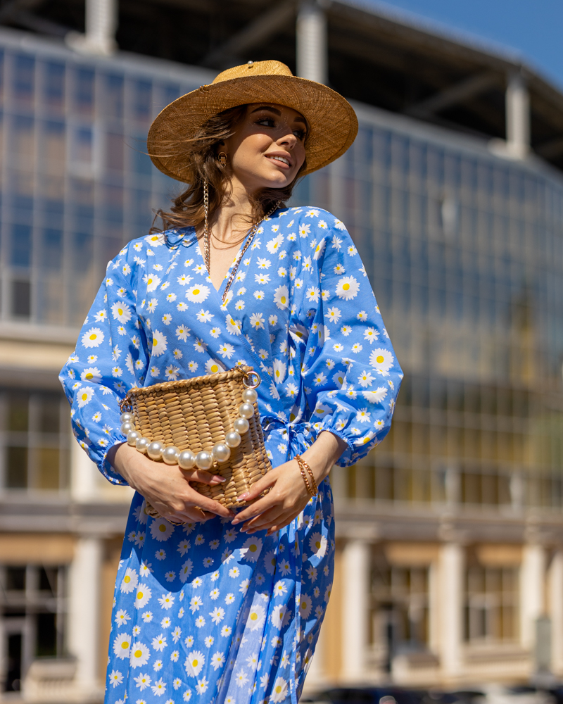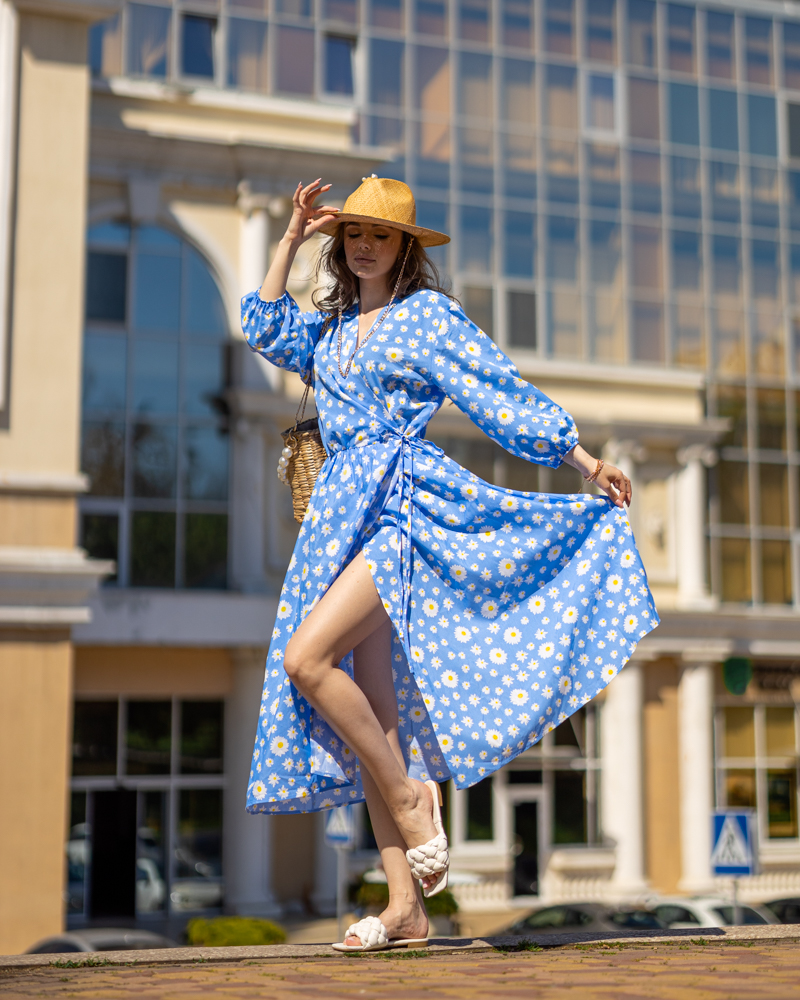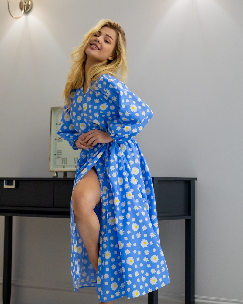 Яскрава та стильна сукня на запах вільного крою із довгими рукавами-ліхтариками на резинці.