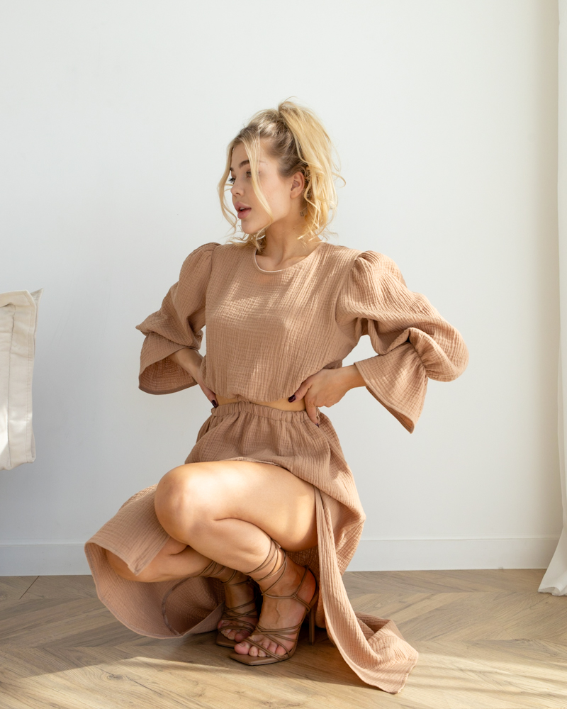 У комплекті топ із рукавами-ліхтариками і воланами та довга спідниця-міді на резинці із розрізом на ніжці, яка з'єднана із топом.