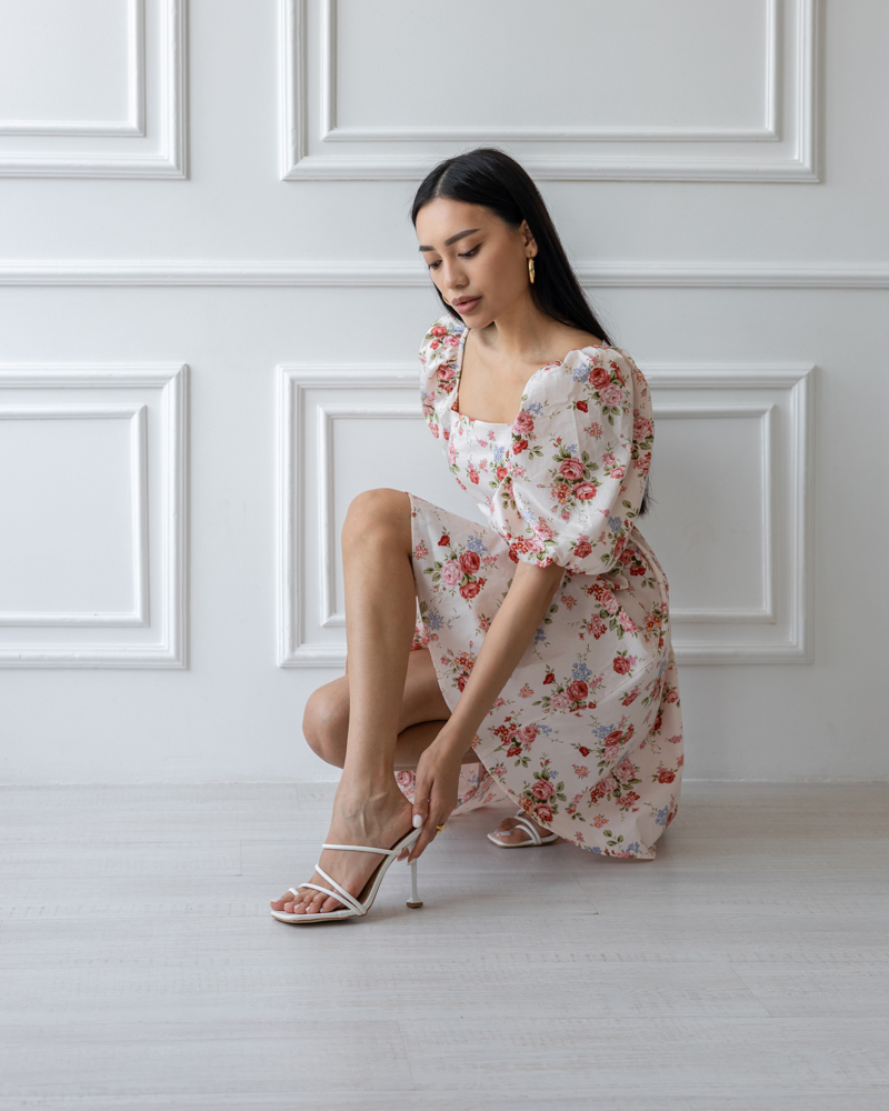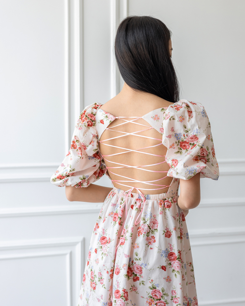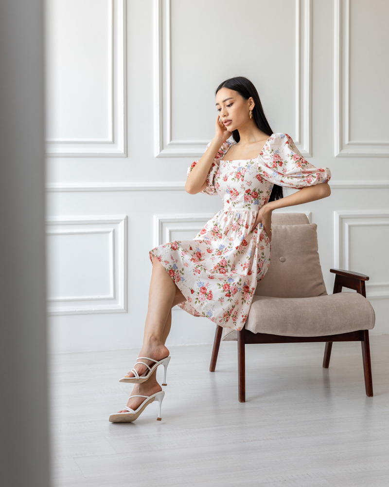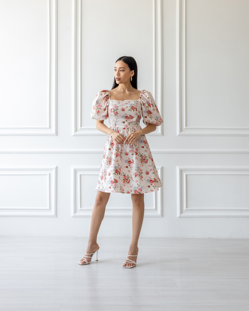 Модель стилізована пишними рукавами-ліхтариками та тоненькою шнурівкою на спині, яка імітує корсет і підкреслює фігуру. Крій спідниці дозволяє почуватися вільно і підходить на будь-який обʼєм стегон.
