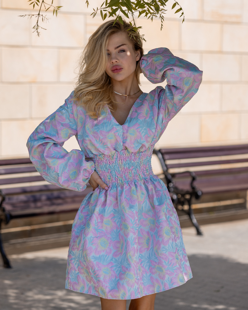 Широка резинка на талії чудово підкреслює фігуру, довгі вільні рукава на резинці, V-подібний виріз спереду та глибокий виріз позаду робить Ваш образ жіночним та унікальним.