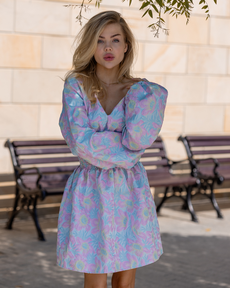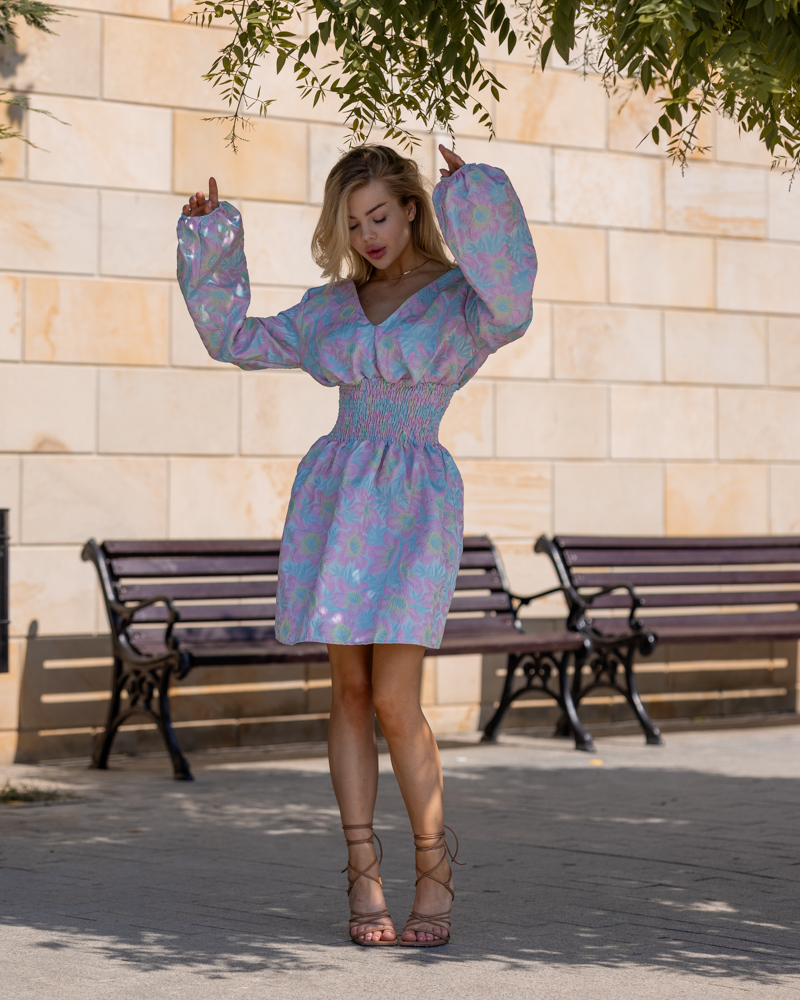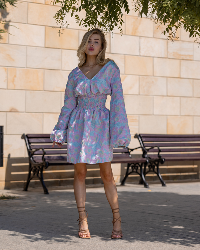Яскрава стильна сукня-міні зроблена із тканини жаккард.
