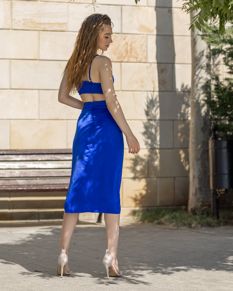 На талії зроблені вирізи, верх та спідниця з'єднані, є регулятори на бретельках, спинка у вигляді резинки, ззаду на спідниці є блискавка та розріз на ніжці.