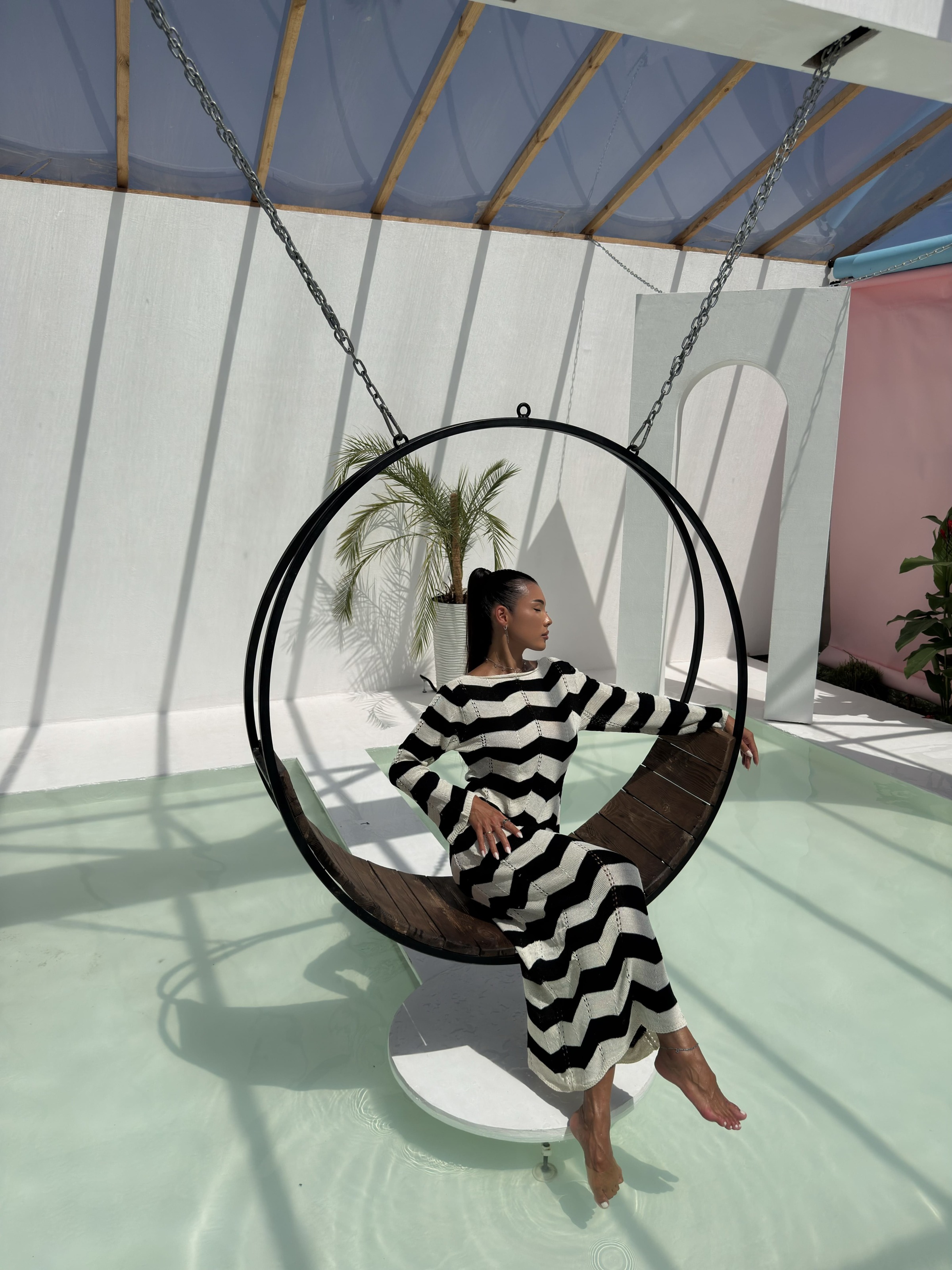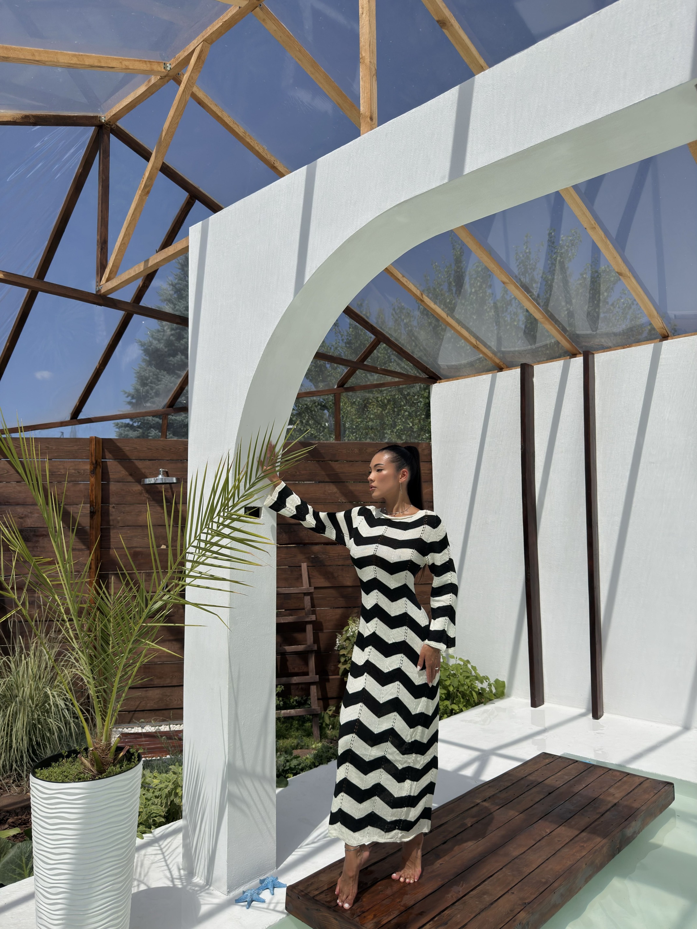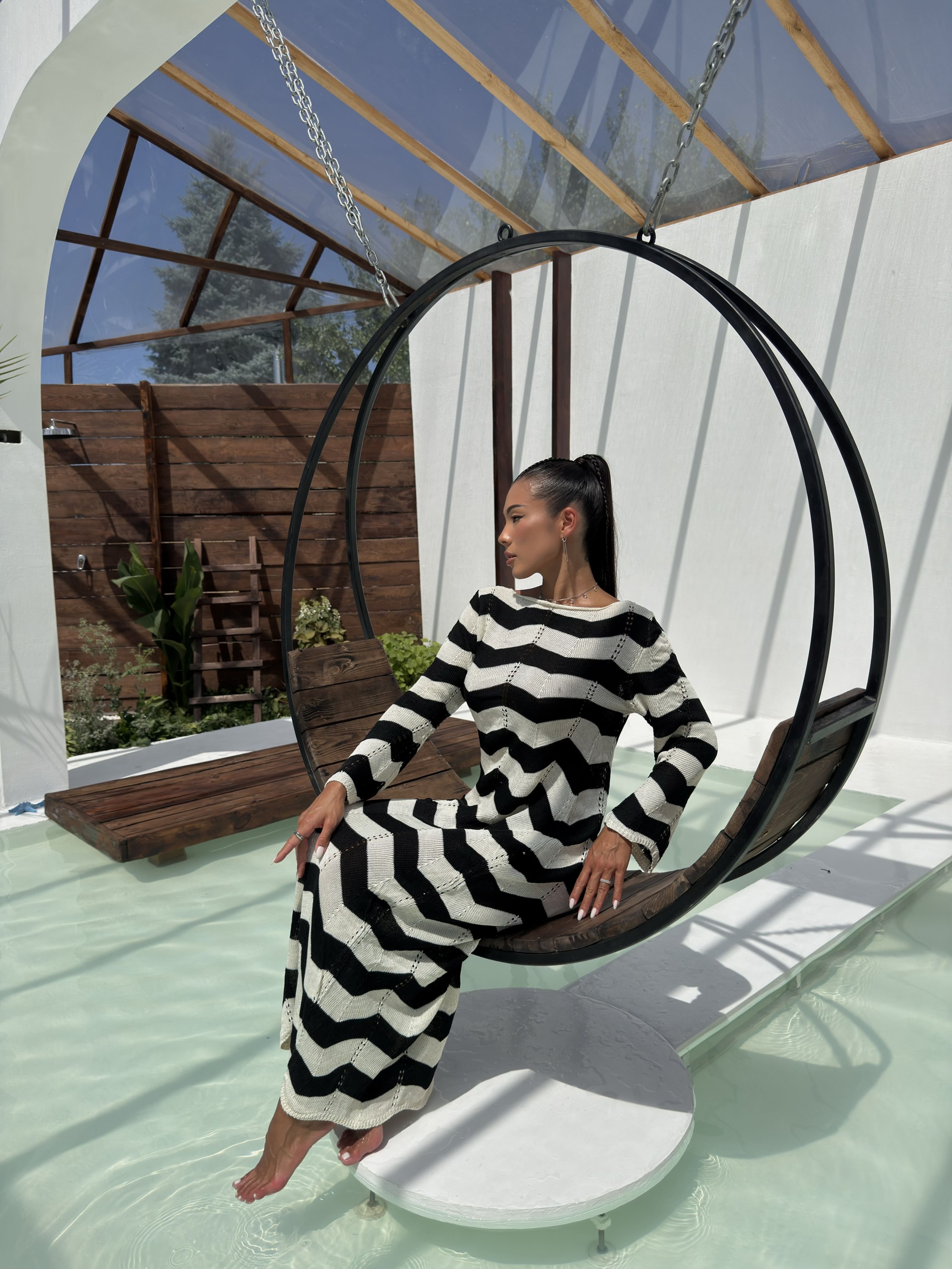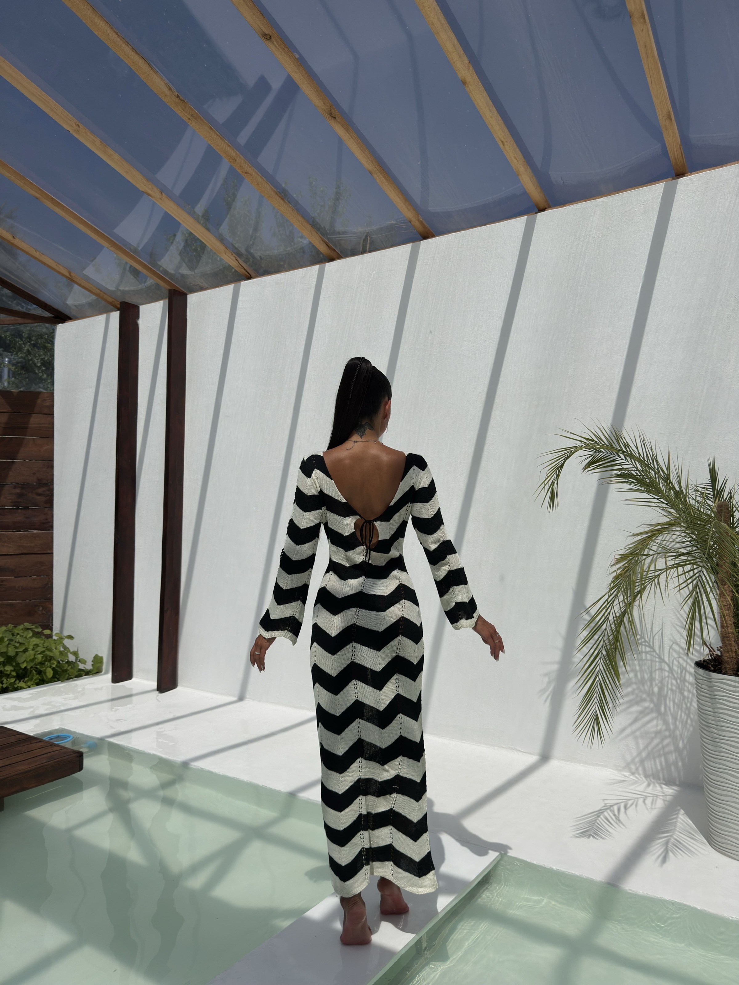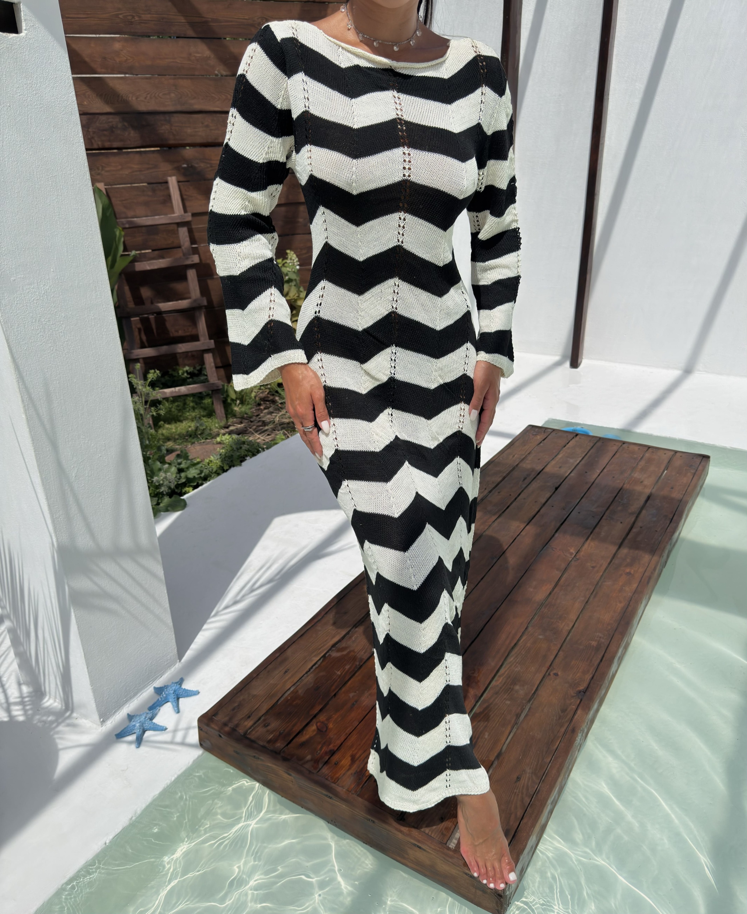 Стильна та зручна в’язана сукня в трендовий чорно-білий зигзаговий візерунок. Модель має жіночний виріз із зав’язками на грудях, довгі рукави та довжину максі. Завдяки м’якій, дихаючій тканині та еластичній в’язці, сукня ідеально підходить як для повсякденного носіння, так і для стильних виходів. Можна носити на дві сторони, змінюючи образ залежно від настрою.